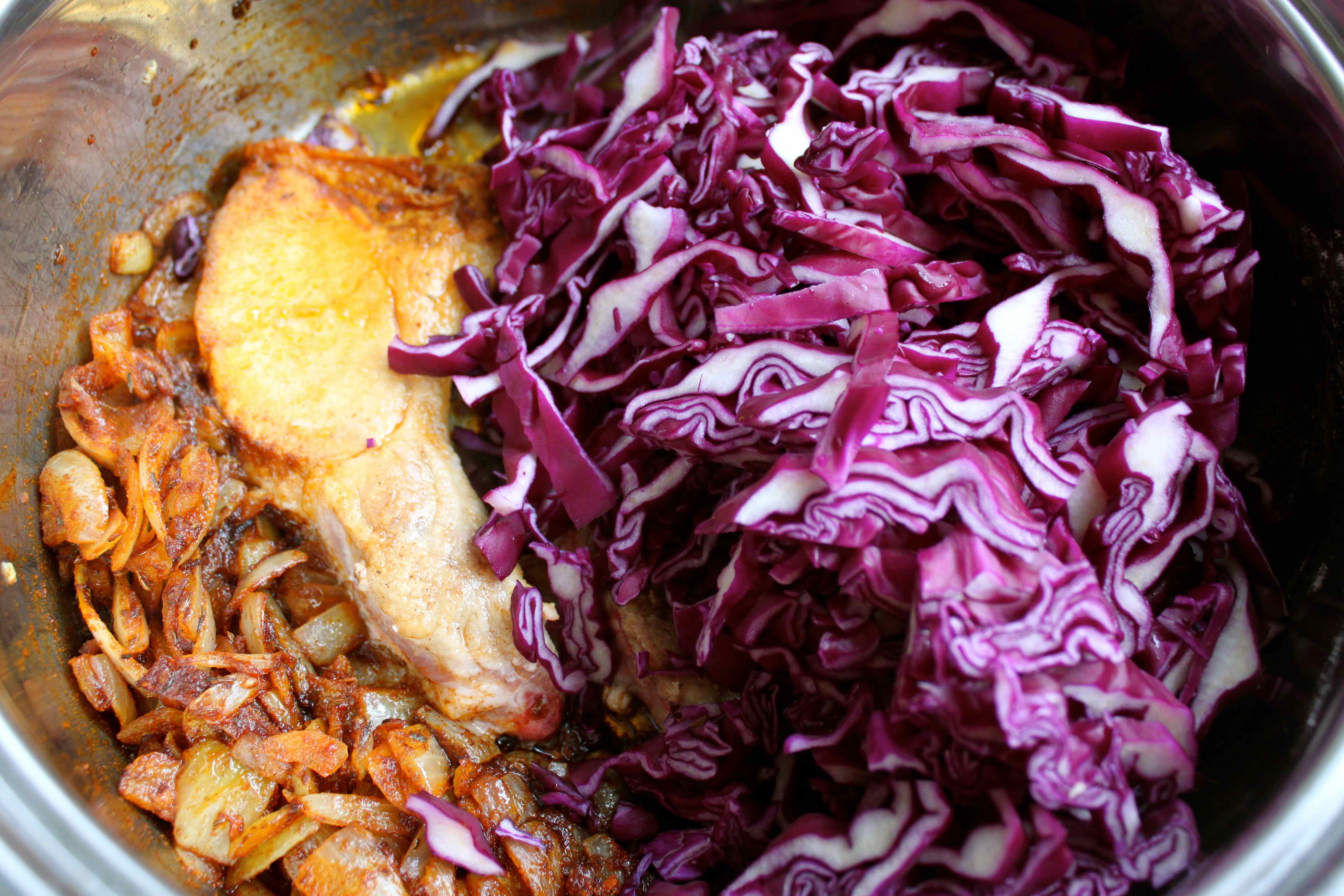 The actual recipe was for pork with red cabbage, pears and ginger. I didn’t quite have those ingredients though so I adapted the recipe slightly.