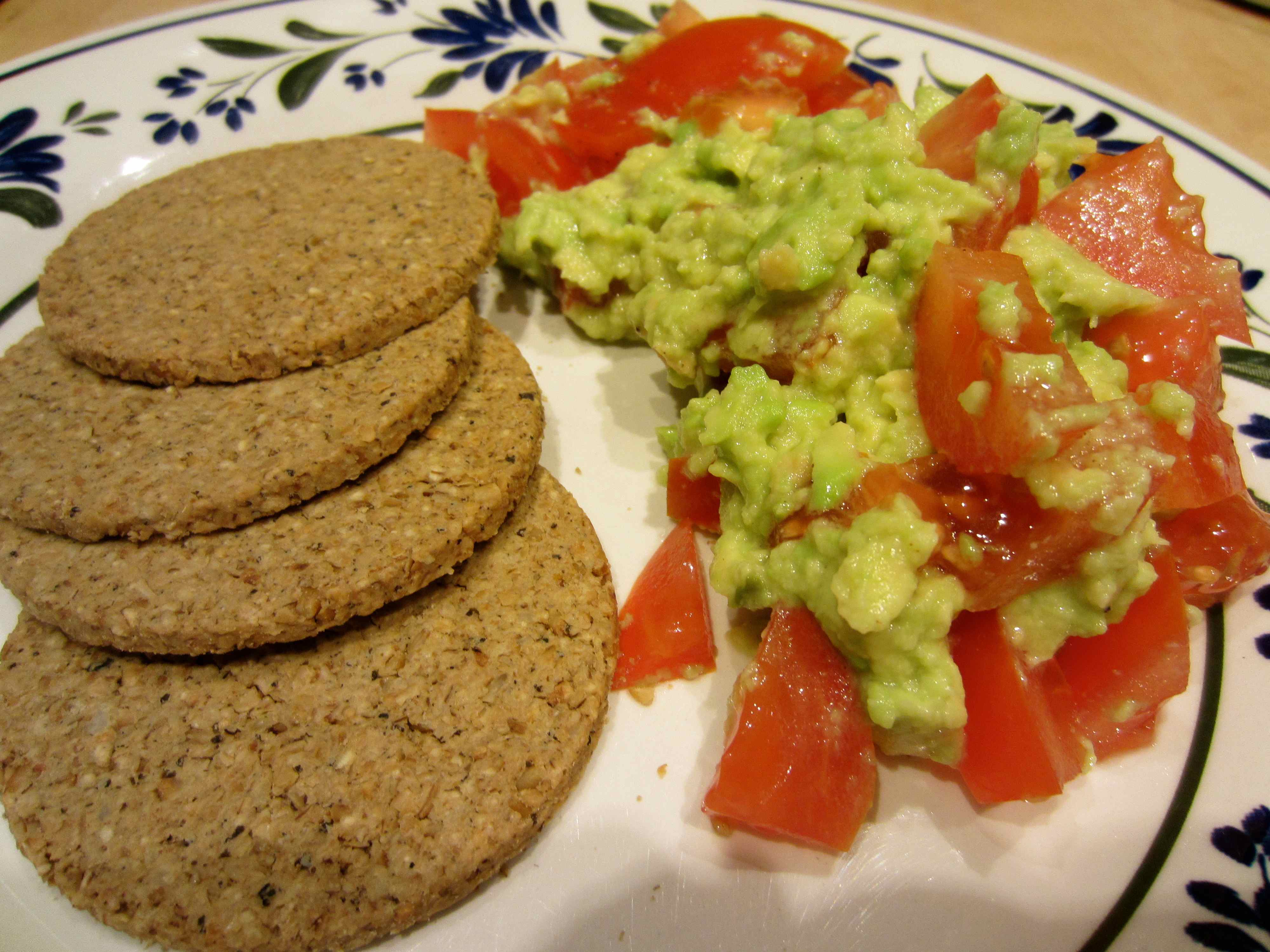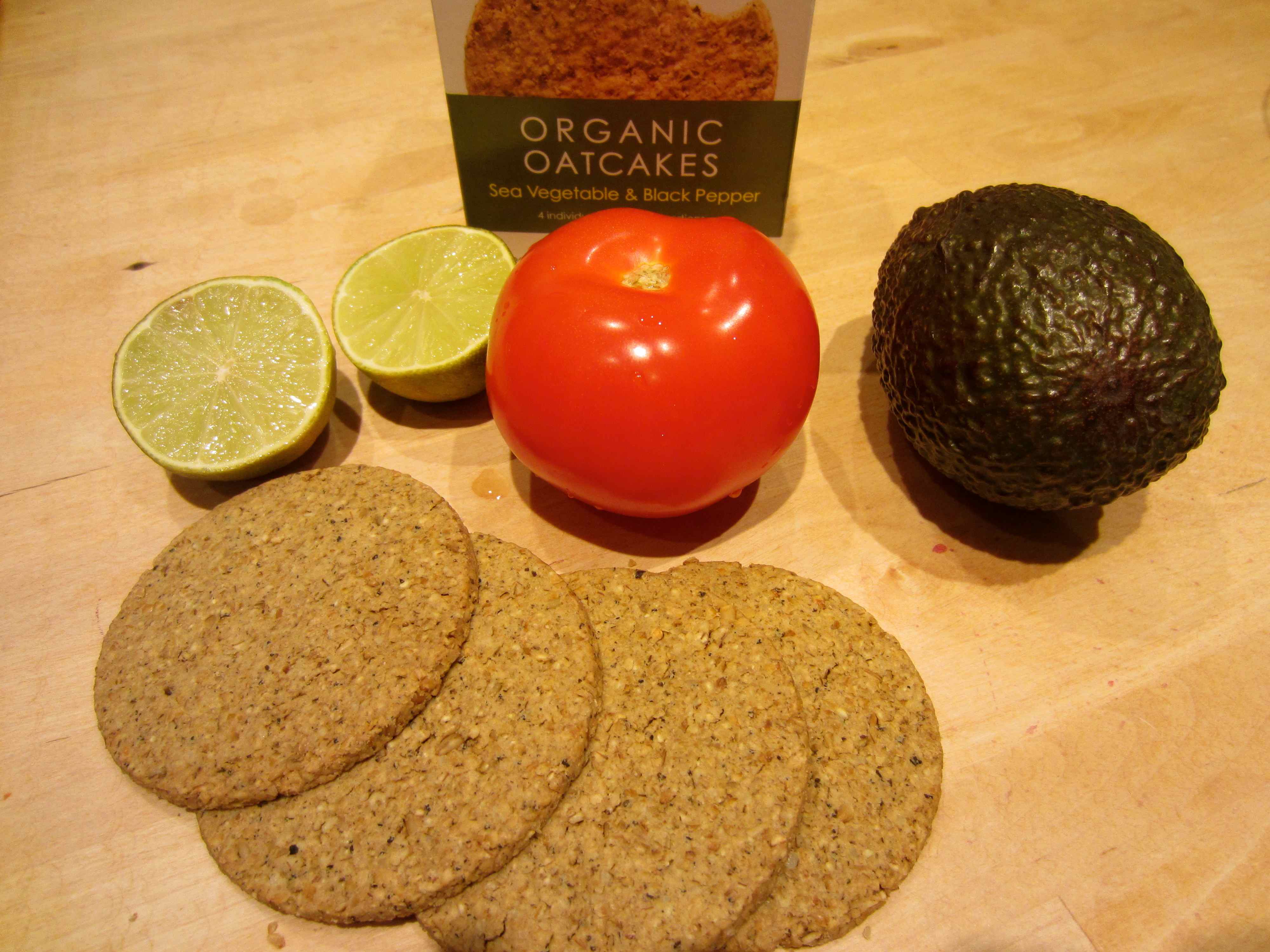I worked late tonight and didn’t get home until 9pm so supper was very simple. The last packet of oatcakes in the box, 1 large tomato, 1 avocado and a lime.