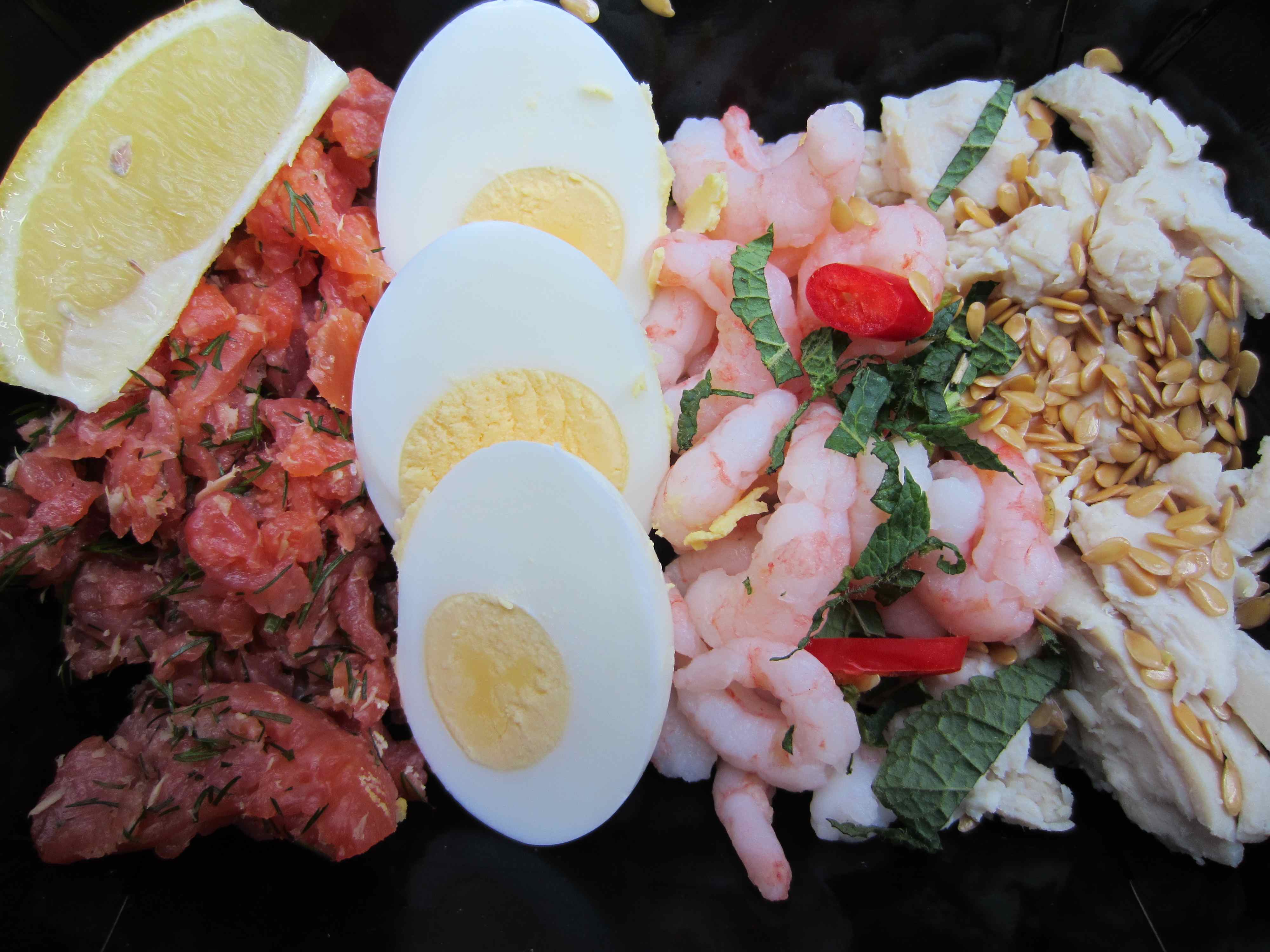 It was delicious and definitely satisfying. There was salmon mixed with dill, one and a half boiled eggs, prawns with fresh mint and red chilli which was a surprisingly good combination and sesame chicken. Really enjoyable.