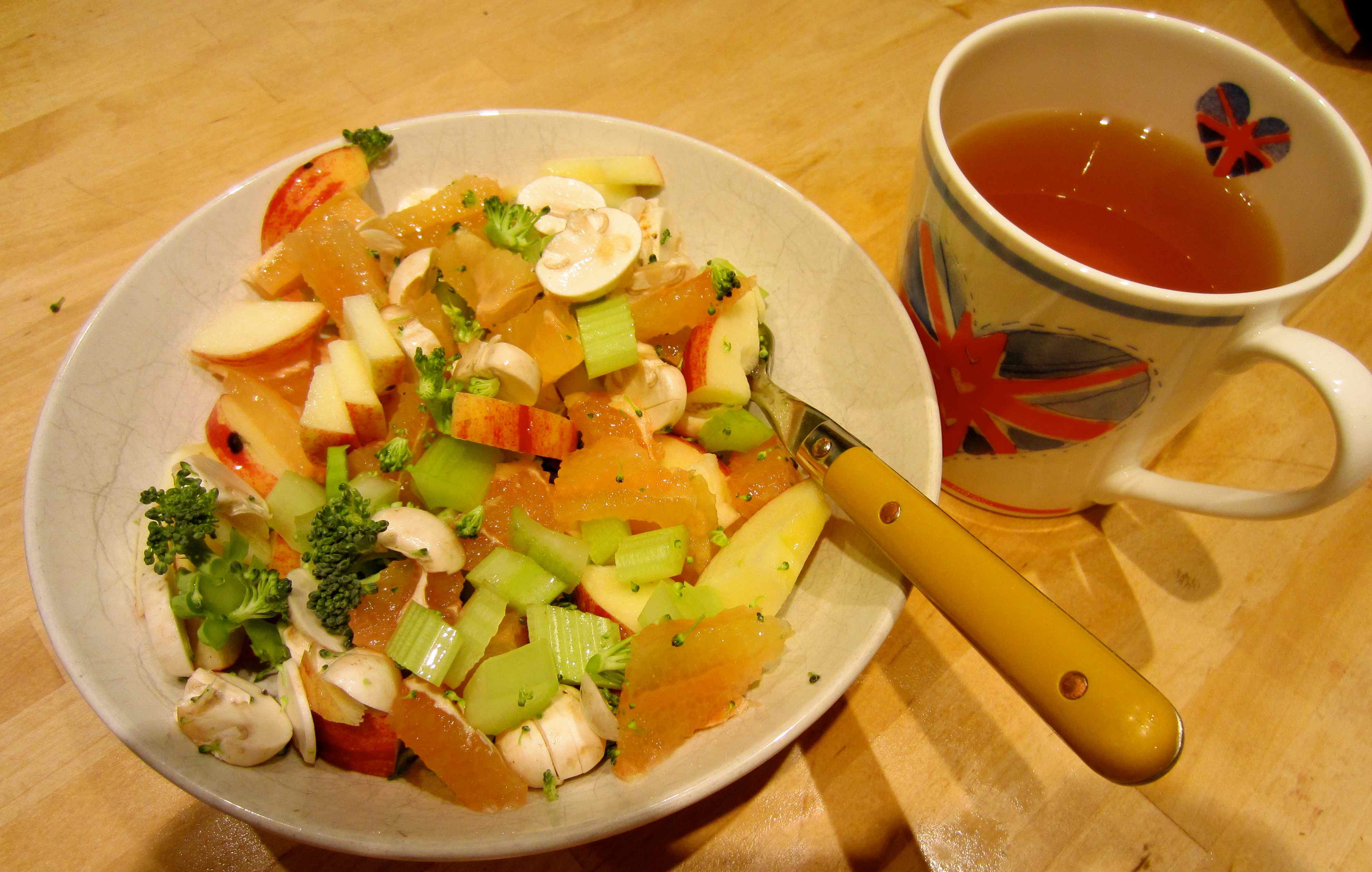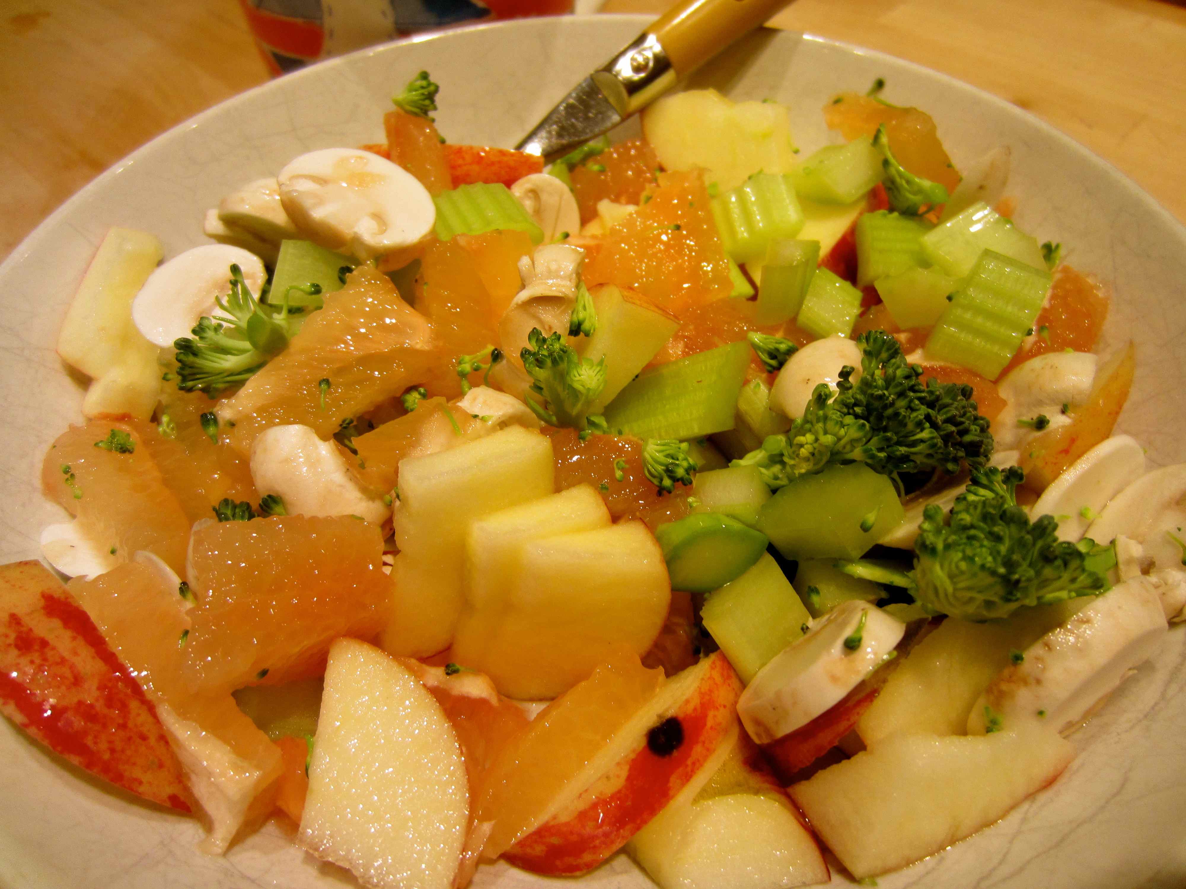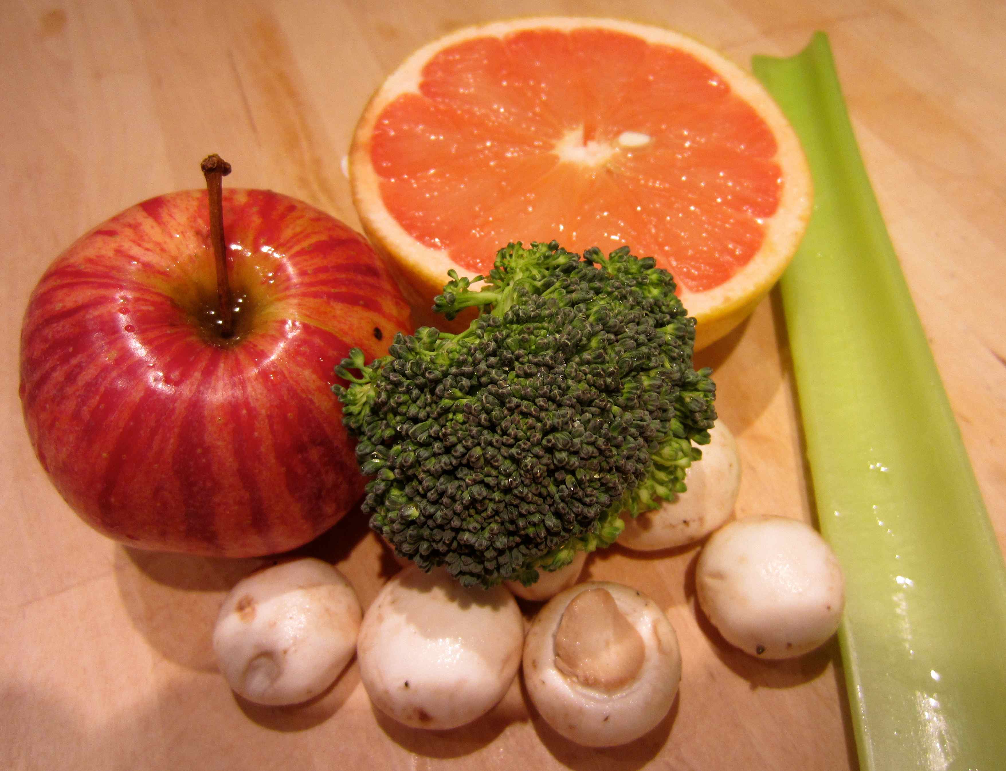 In the evening I had about 150 calories left so I rummaged round the fridge and pulled out some fruits and vegetables: half a pink grapefruit, 1 celery stick, 1 large broccoli floret, some button mushrooms and a Gala apple.