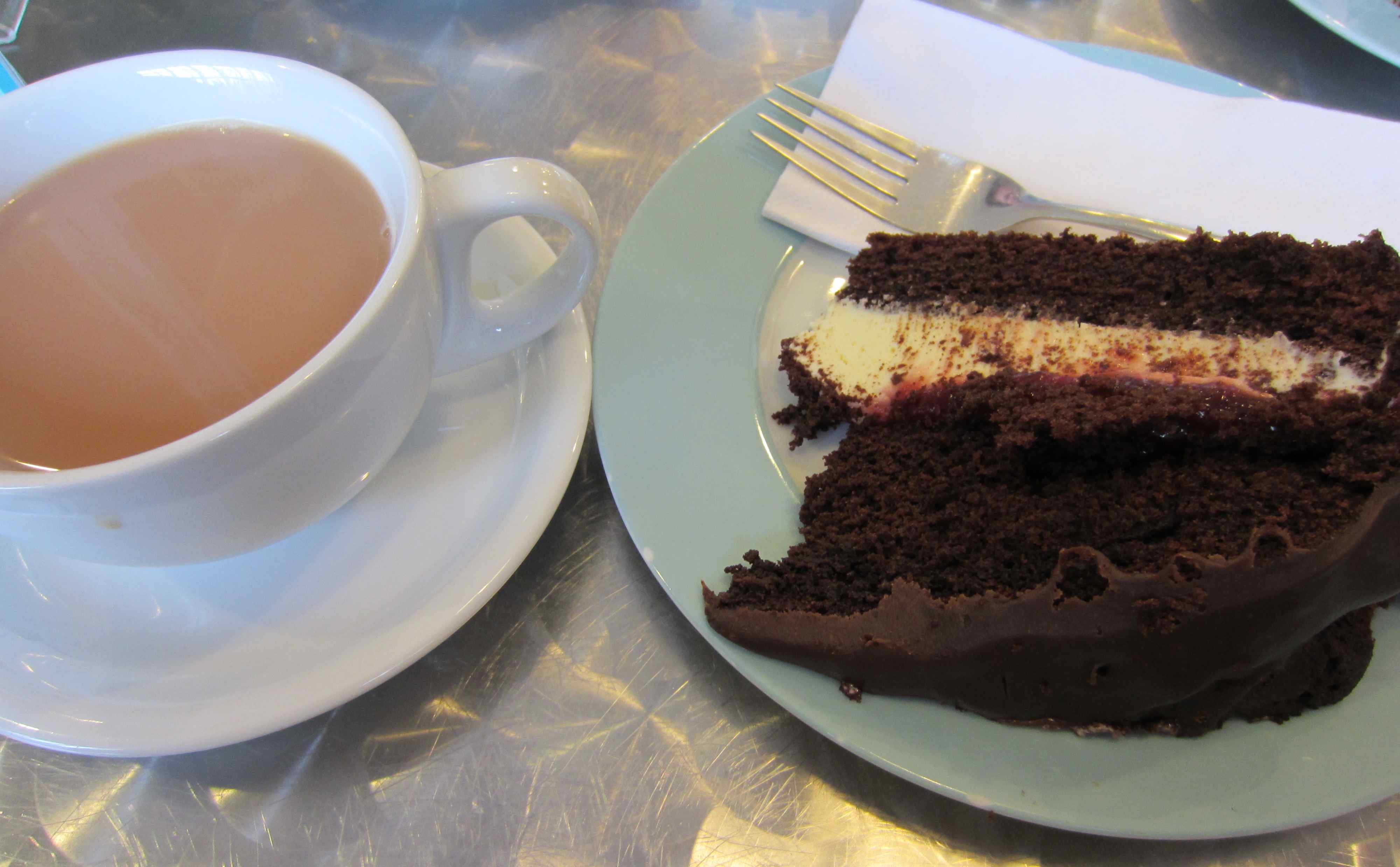 This cup of tea and slice of chocolate cake and cherries was too tempting to resist.
