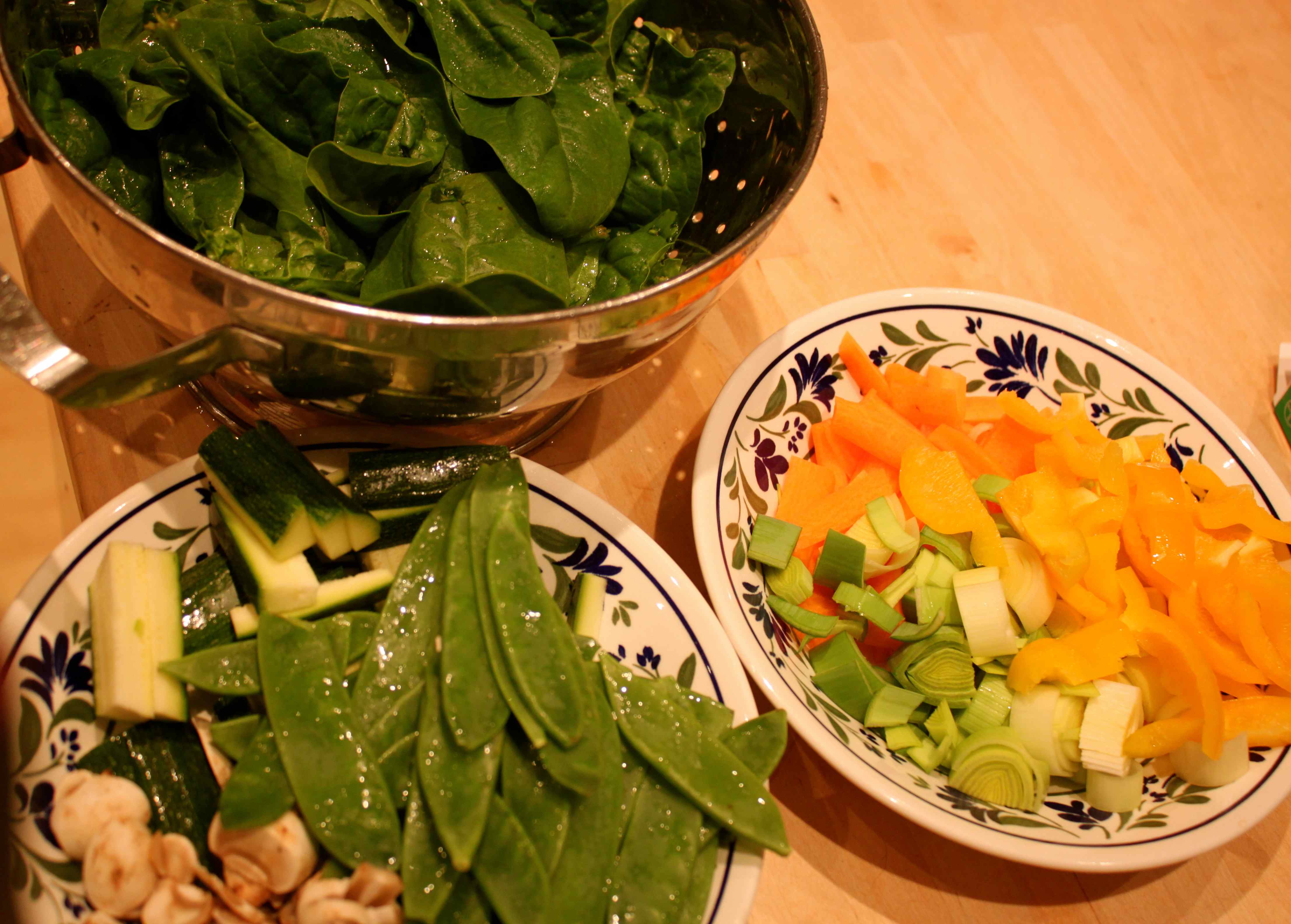 A quick supper was in order. A stack of veggies, all chopped and ready for stir frying: spinach, carrots, yellow pepper, leek, courgette, mange tout and mushrooms.