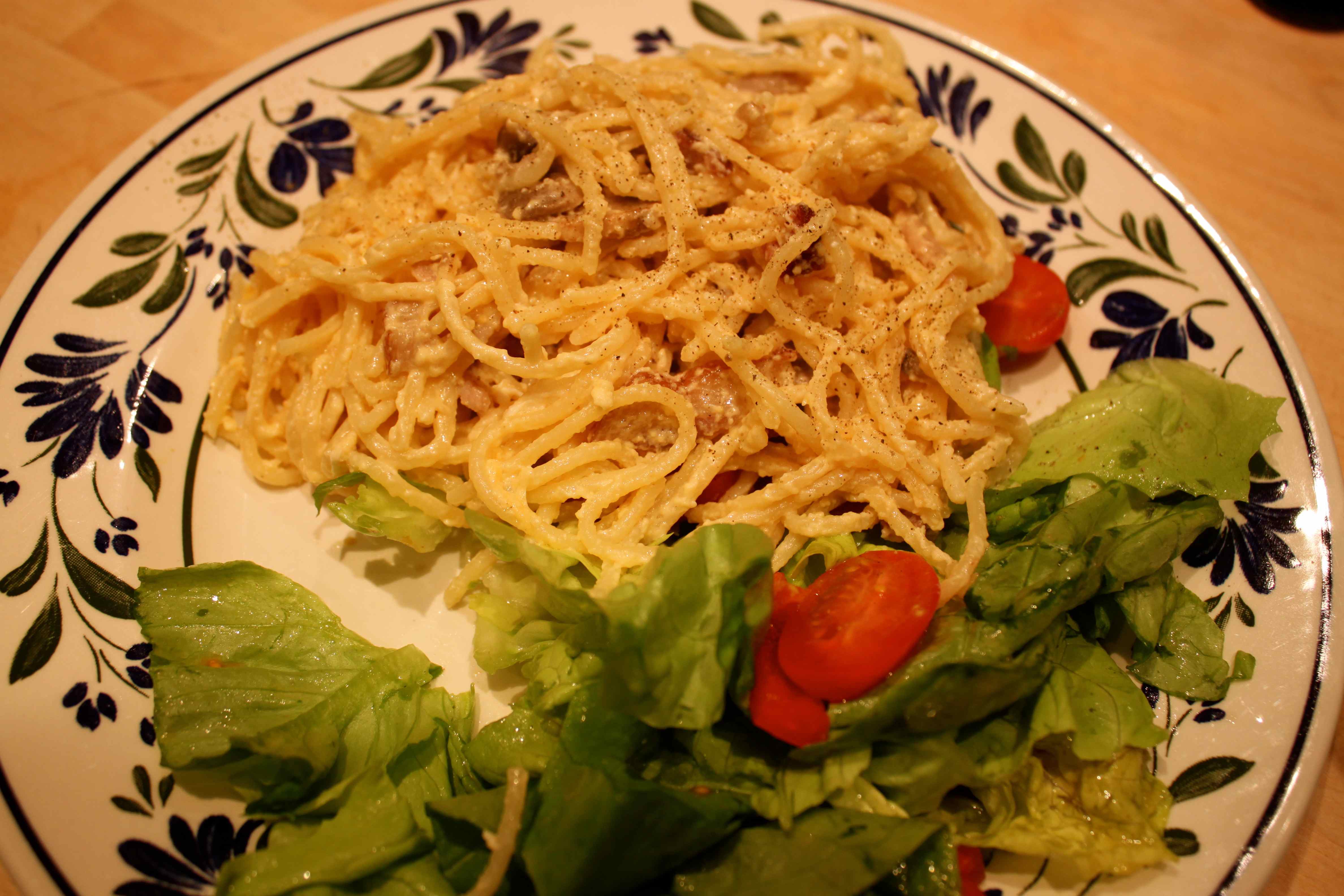 That did the trick until supper time. Dinner will not win any healthy eating points but it was really good. Lara had some friends over and cooked them spaghetti carbonara with a salad. She made extra so we could have some too. I resisted the extra cheese she had grated to put on top and had a modest portion. The salad had a homemade French Dressing on it. I estimate this meal to be 697 calories.