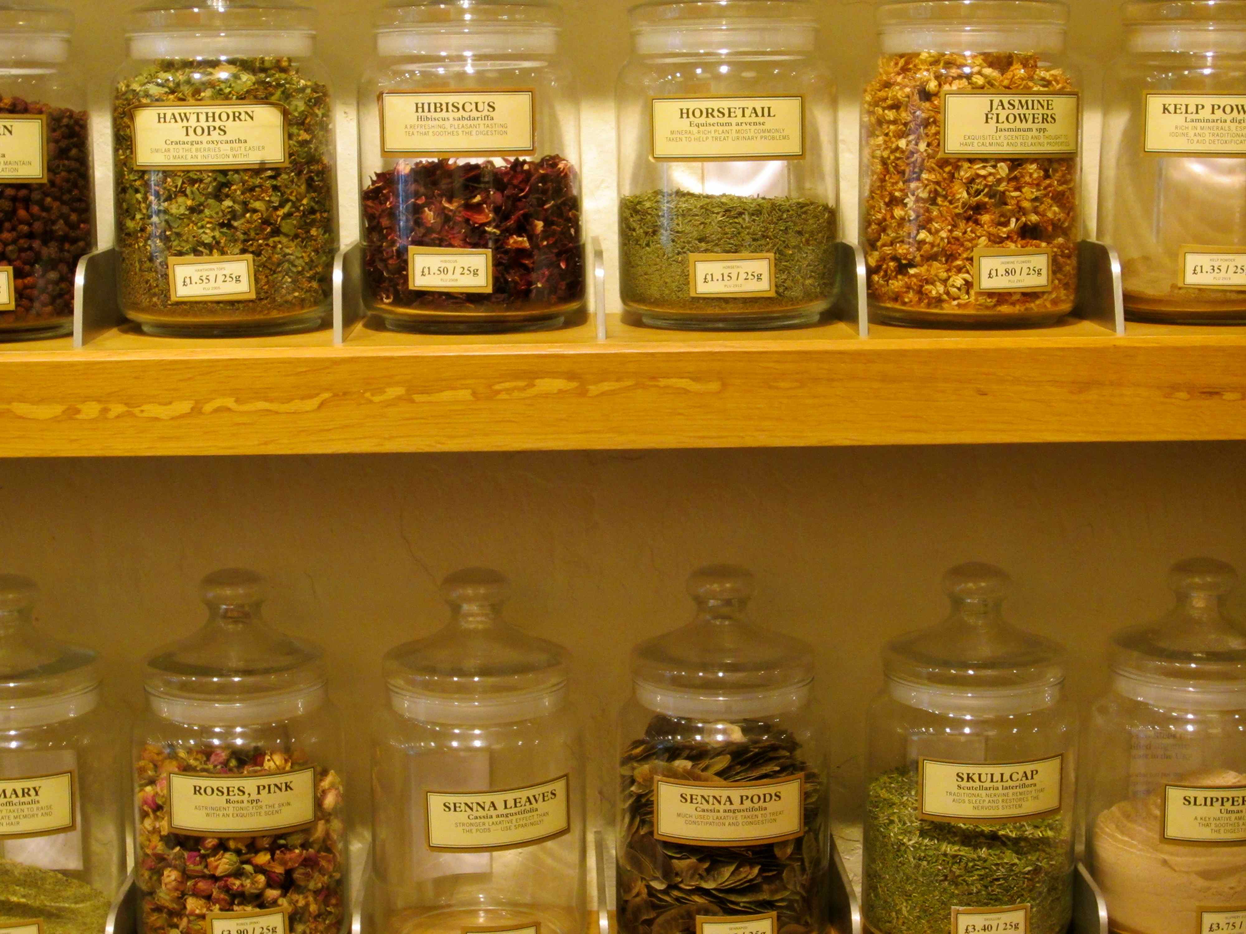 There are rows of dried plants in jars behind the counter.