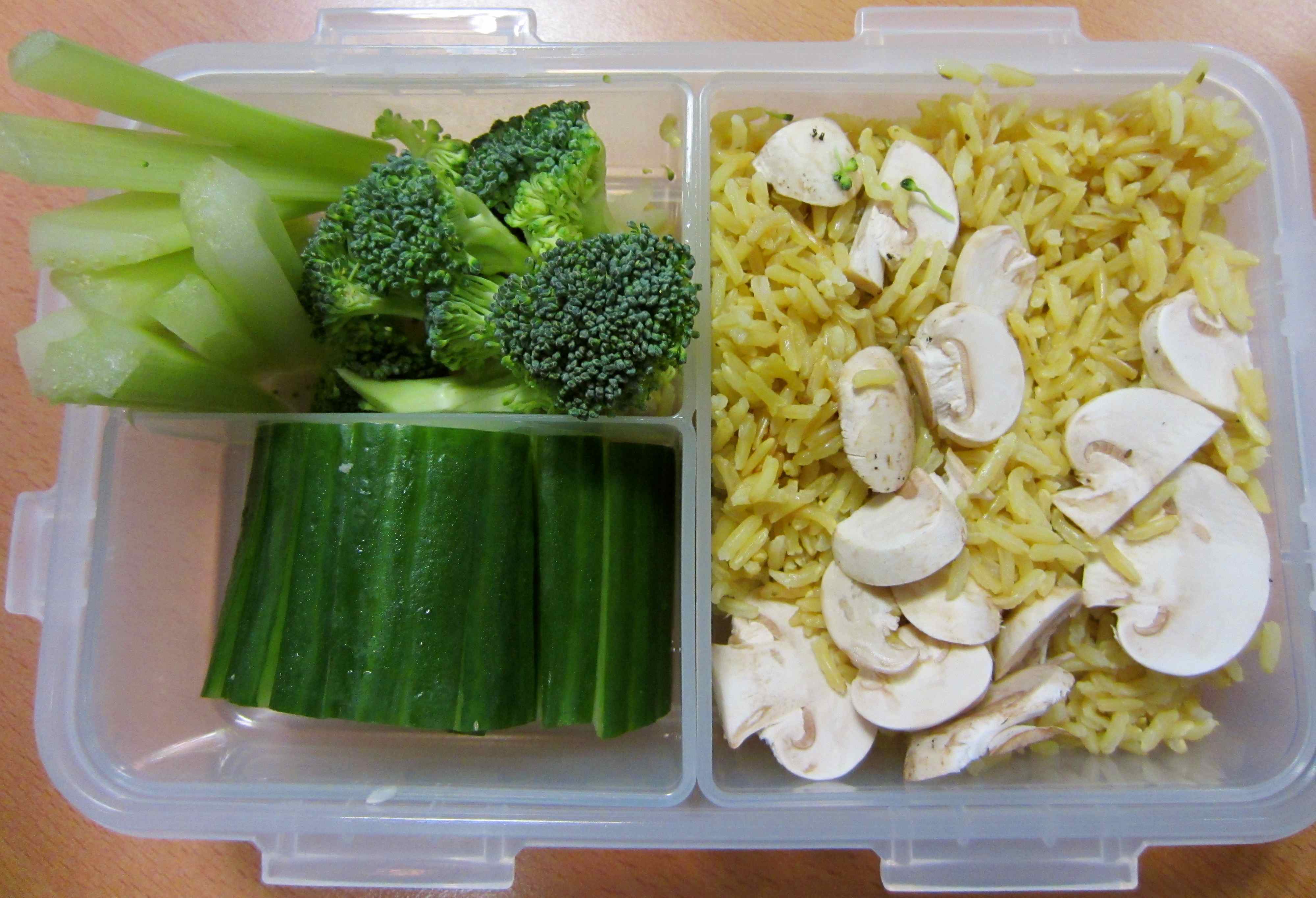 This was only intended to be a snack but it ended up being my entire lunch: 120 g brown basmati rice, 3 raw button mushrooms, cucumber sticks, a celery stalk and some raw broccoli florets. I can not pretend it was particularly enjoyable but I did not dislike it and I just slowly munched it while I worked. 165 calories. Yes, just 165 calories and it kept me full until supper time.