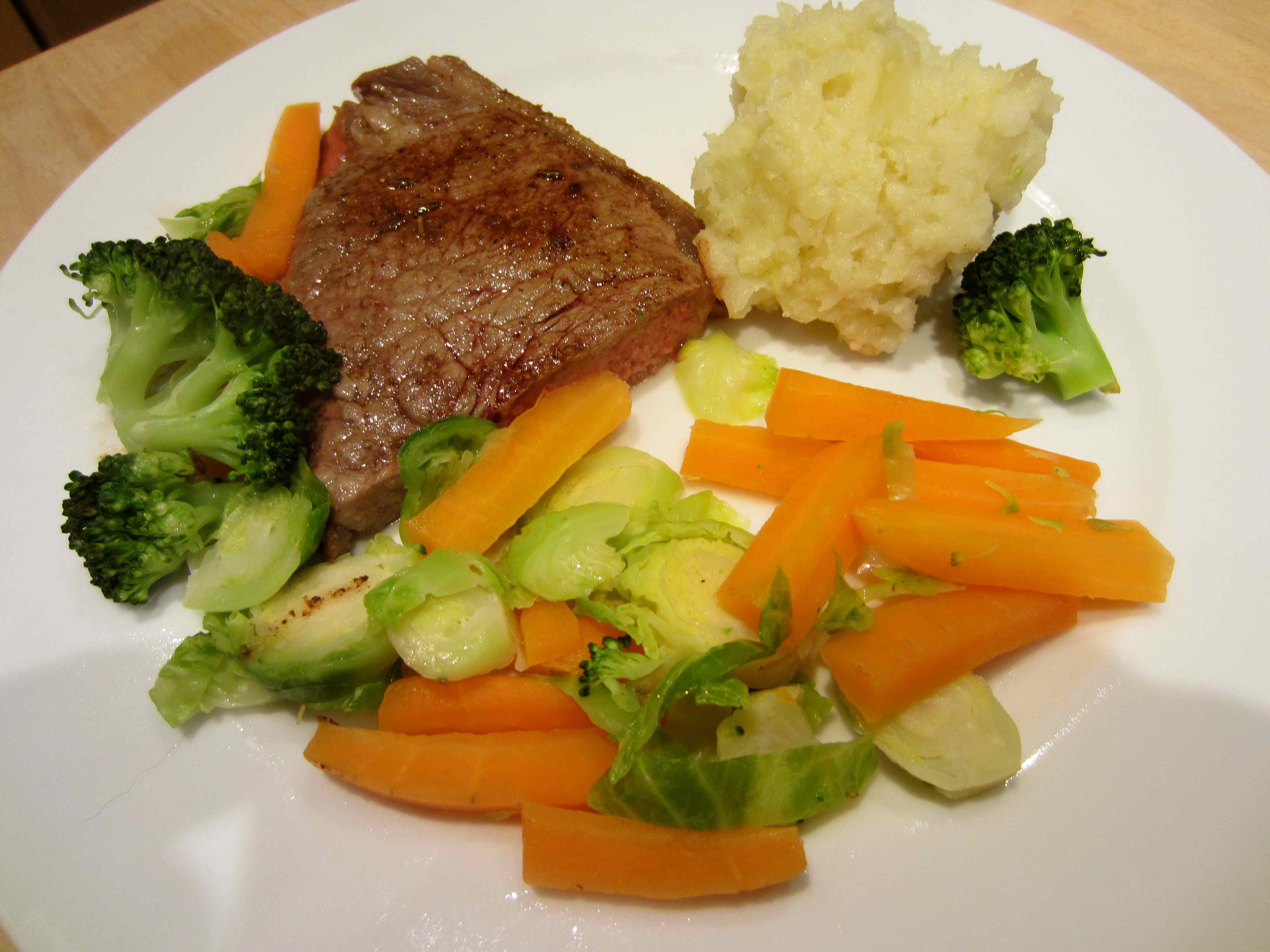 With steamed broccoli, carrots and brussels sprouts.