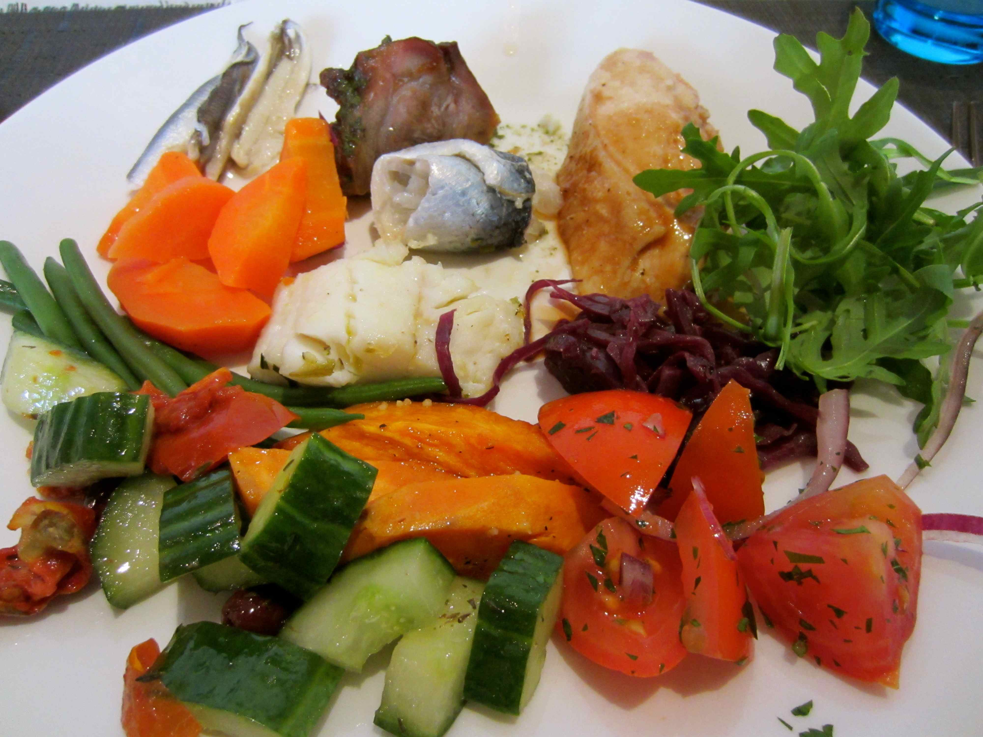 After working all morning I was prepared for the usual tragic round of wilting sandwiches to come out . I was wrong! We had a delicious hot buffet instead. I picked a small portion of all the healthiest things on the menu: a slice of roast lamb with mint sauce (which was actually so chewy I left it), half a chicken breast ( I didn’t eat the skin), a small piece of cod, a rollmop herring, 4 anchovies, carrots, red cabbage, green beans, rocket, cucumber and a tomato and onion salad.
