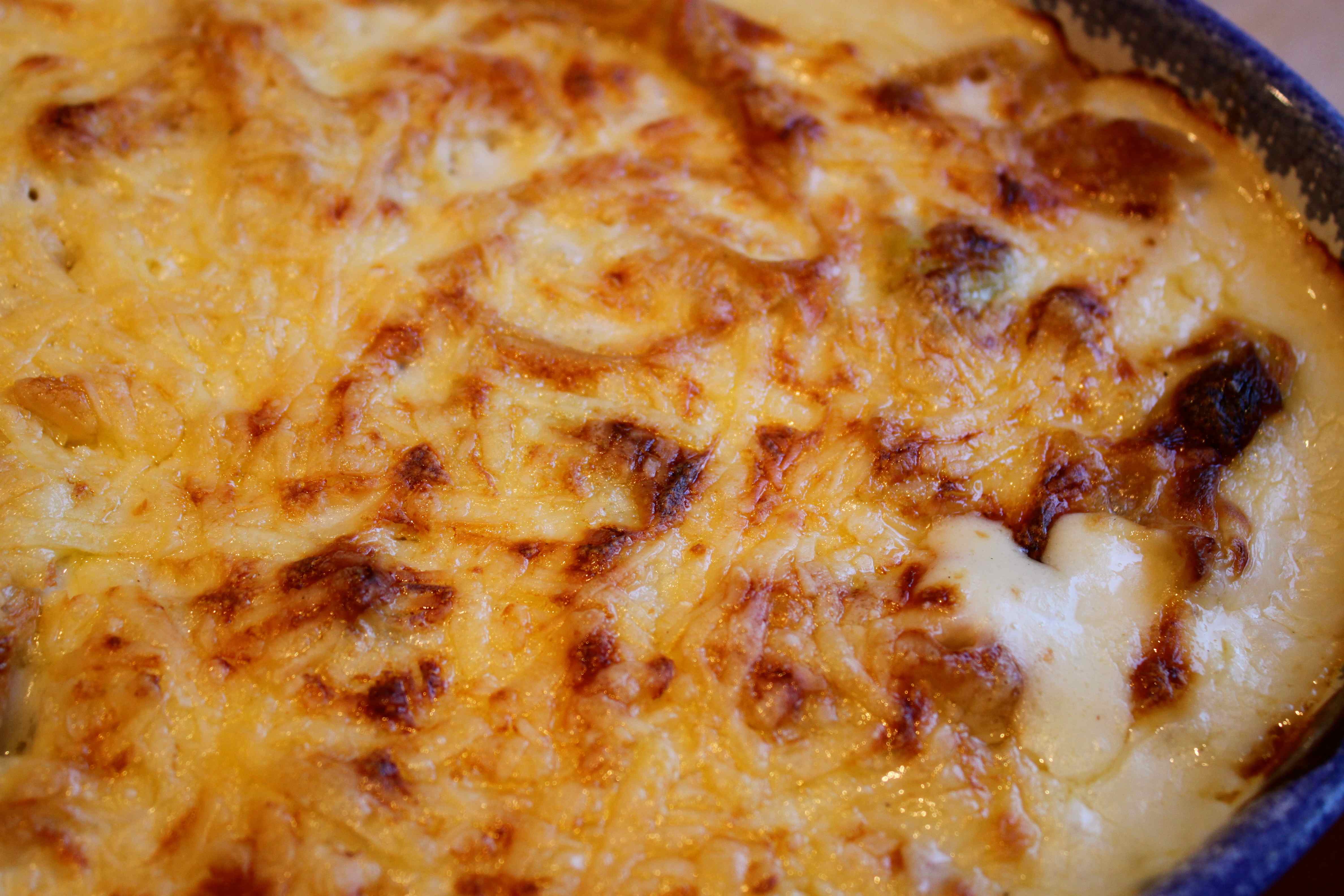 Supper time. I used a Delia recipe for macaroni cheese with bacon and leek. I added an onion too.