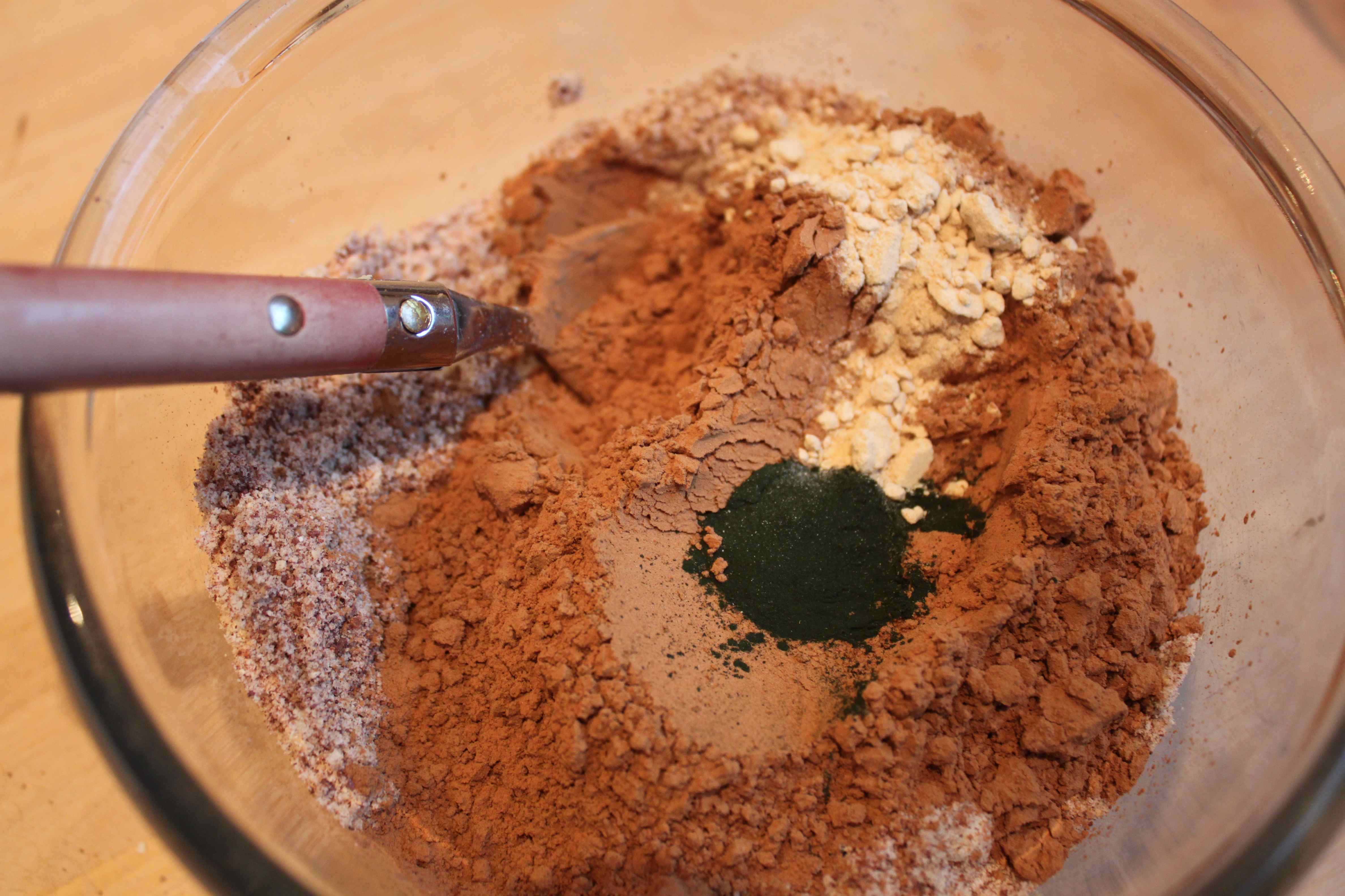Stir in to the melted cacao butter and coconut oil.