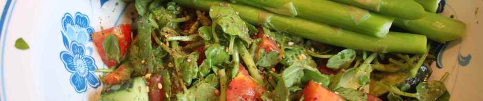 Supper last night was a healthy salad, Fattoush, followed by a sweet chocolate treat. Apart from the asparagus I served with the salad, it was all raw.
