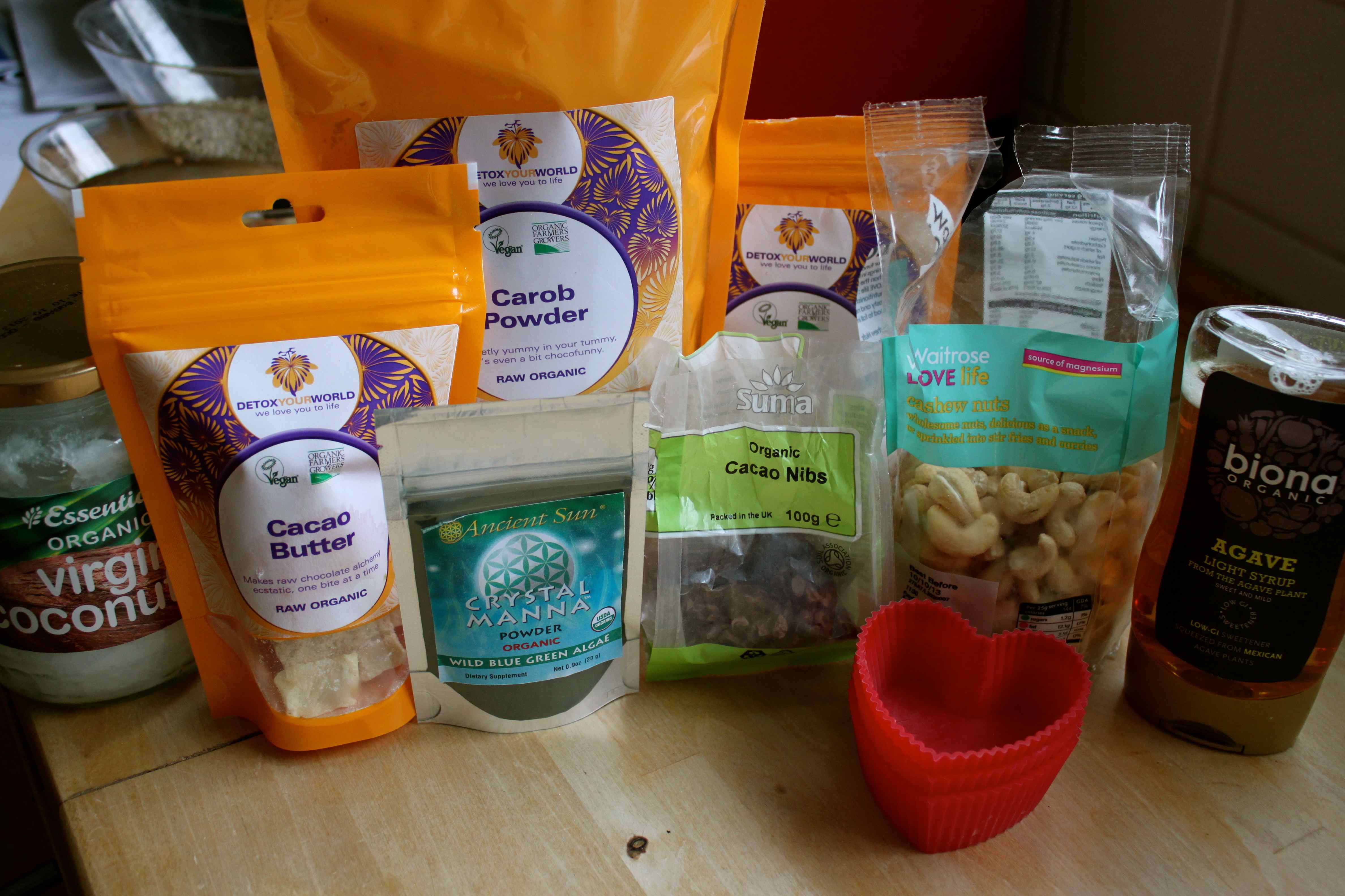 Add the carob, agave, Blue Manna and macs to the cacao and cashew nuts.