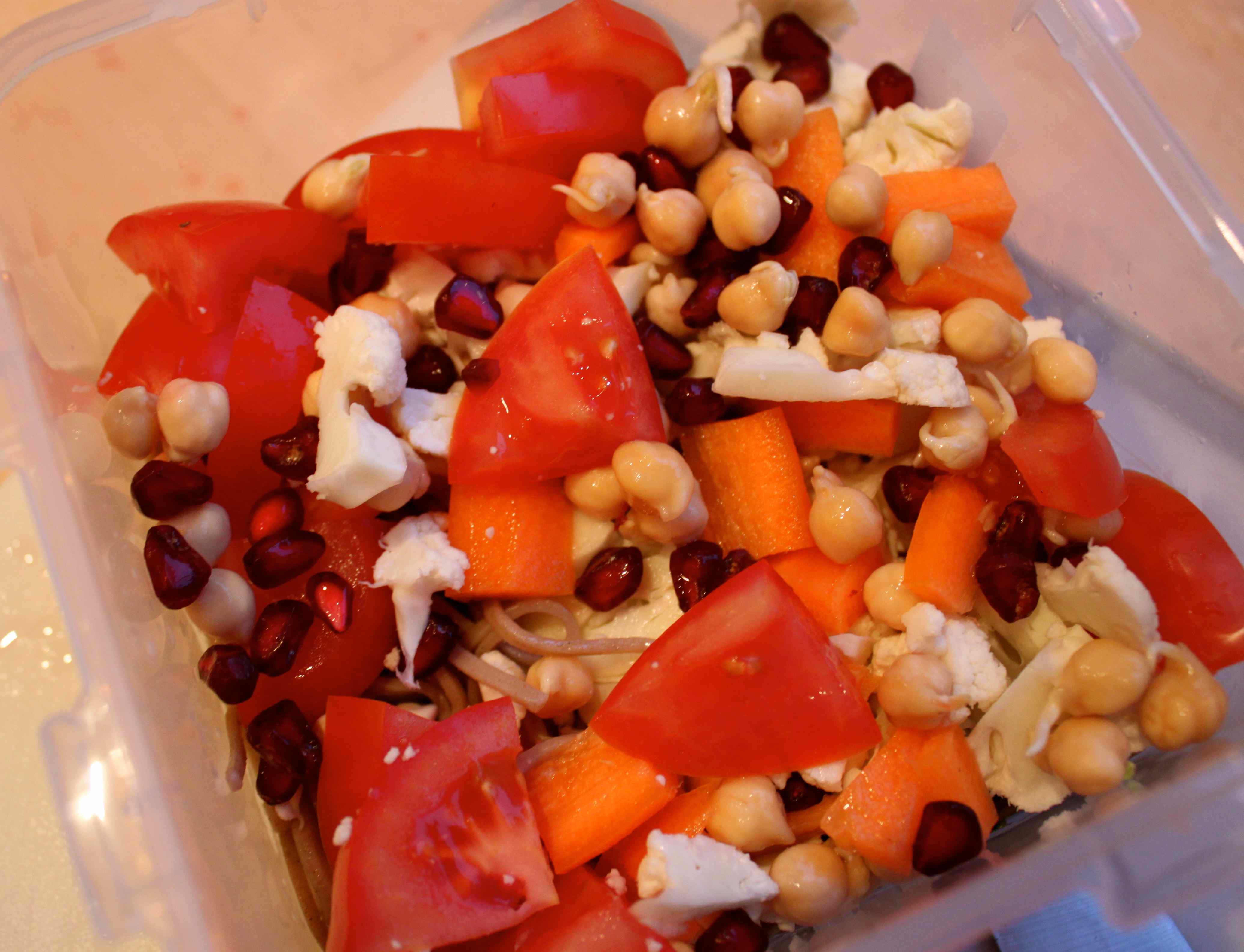 Lunch was great and again I made it last night. In to my lunch box went some left over wholewheat Udon noodles (we had them for lunch on Sunday), raw cauliflower, some chick peas I had sprouted, tomatoes, carrots and pomegranate.