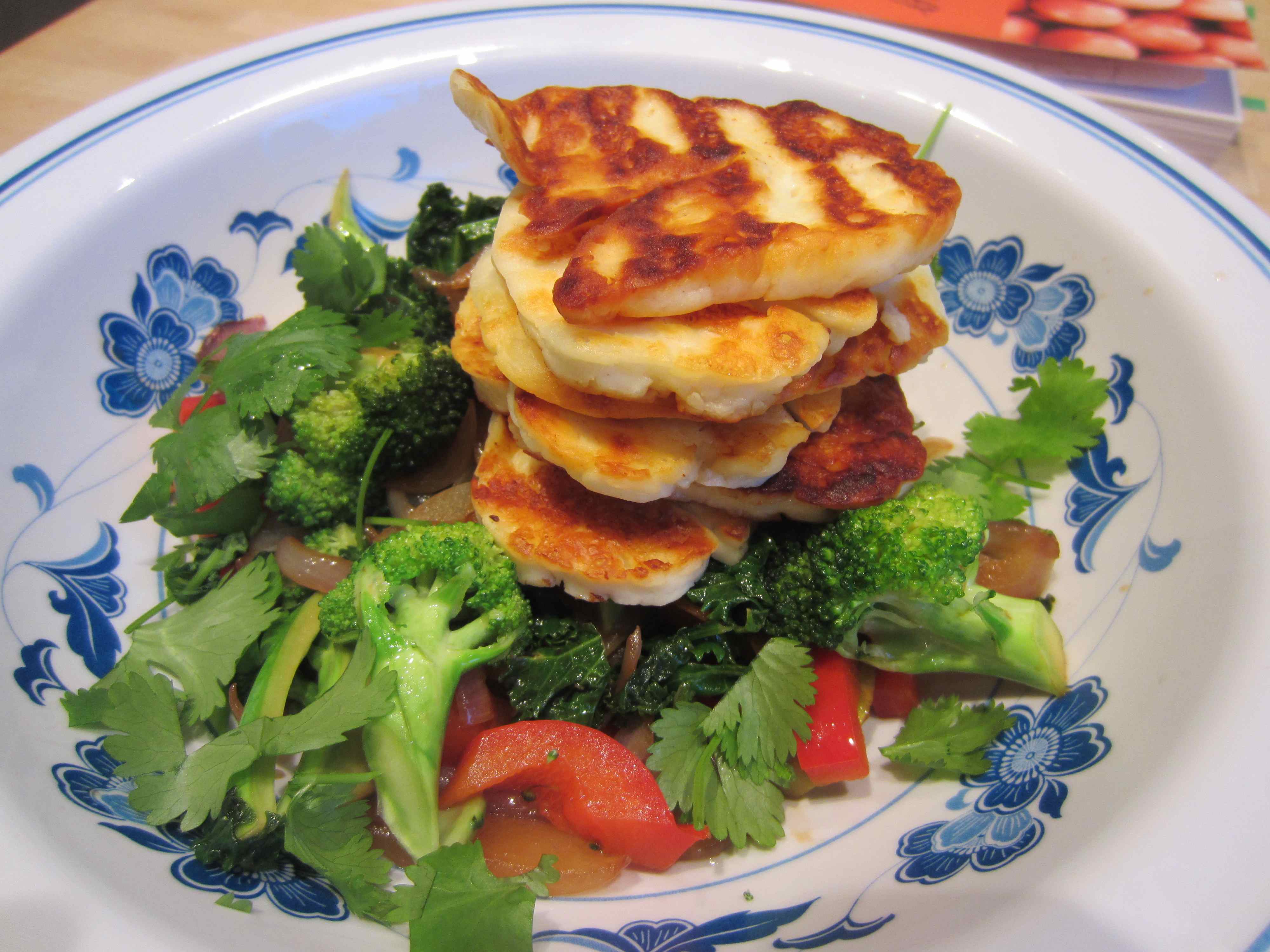 At home I had a fancy for onions, Tamari and Halloumi. I have had very little cheese recently and felt I could justify some tonight. For 2 of us, I chopped up a large red pepper, one brown and one red onion, half a head and stalk of broccoli and a huge handful of kale. I stir fried them with some coconut oil.