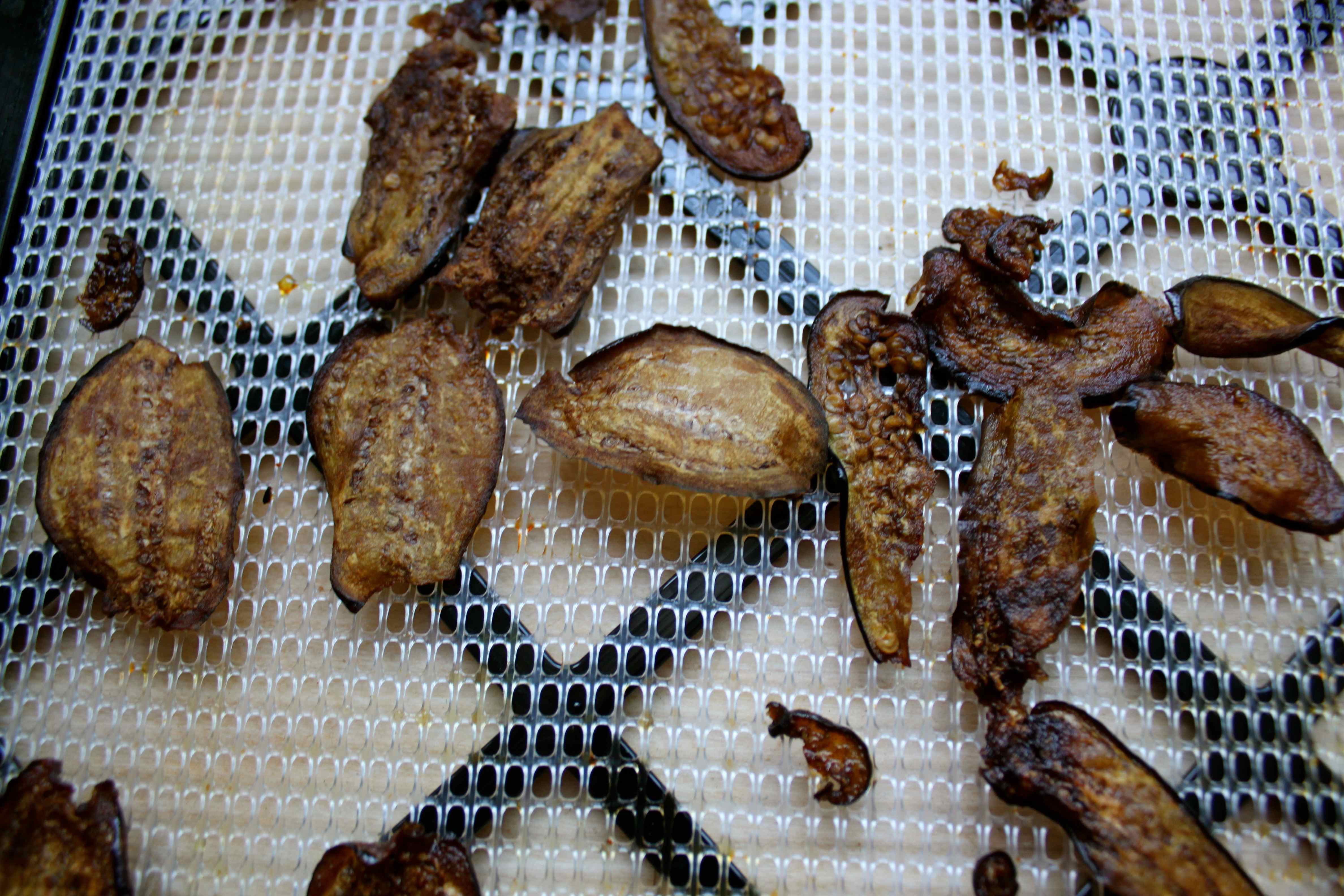 After about 10 hours some slices of aubergine were crispy but the thicker bits were still chewy. So I have left them dehydrating a little longer.