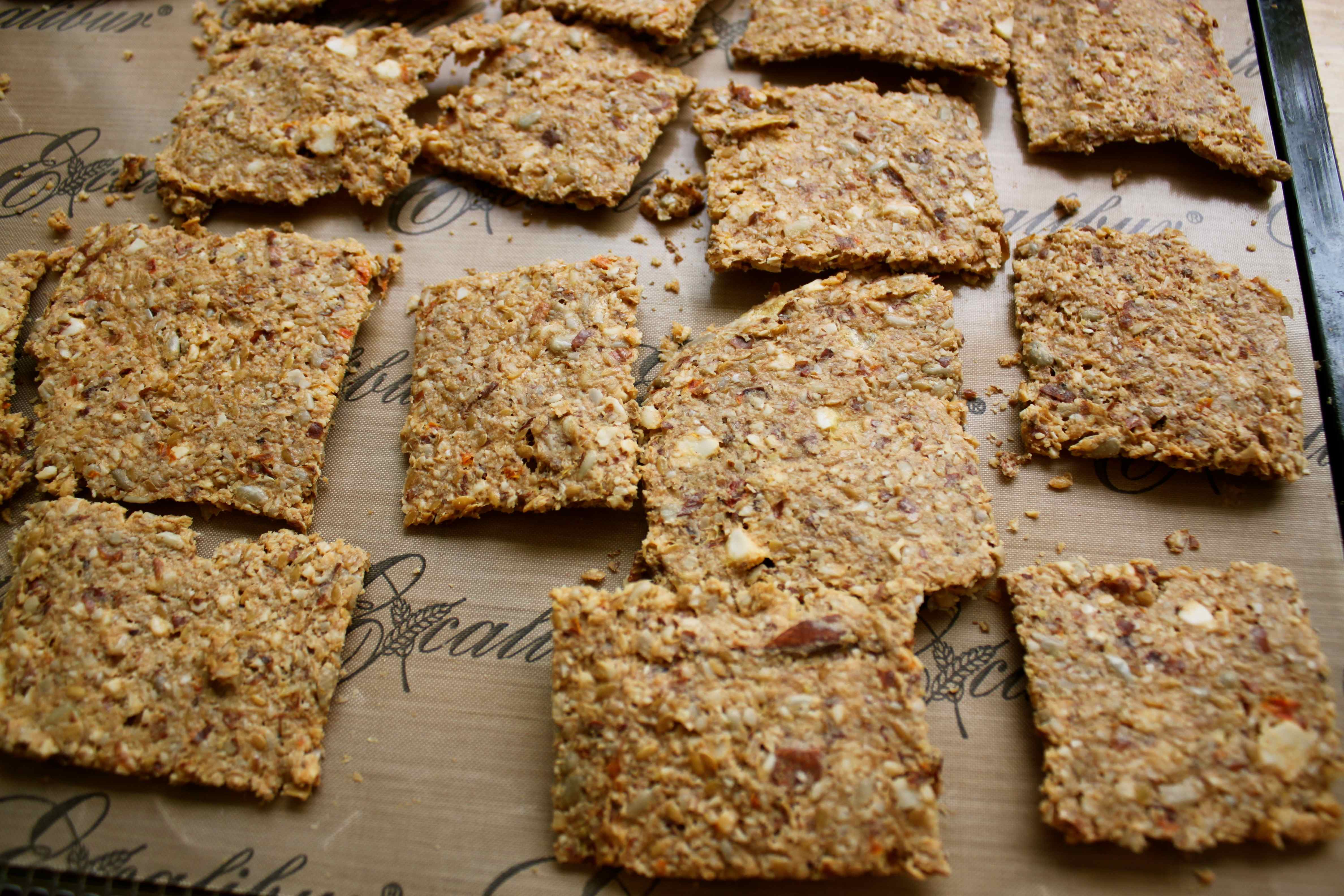 After a few more hours in the dehydrator, these nut and flax crackers finally dried out sufficiently. I wanted to take some out for lunch today. We were all contributing food and I was taking cheese, fruit and crackers.