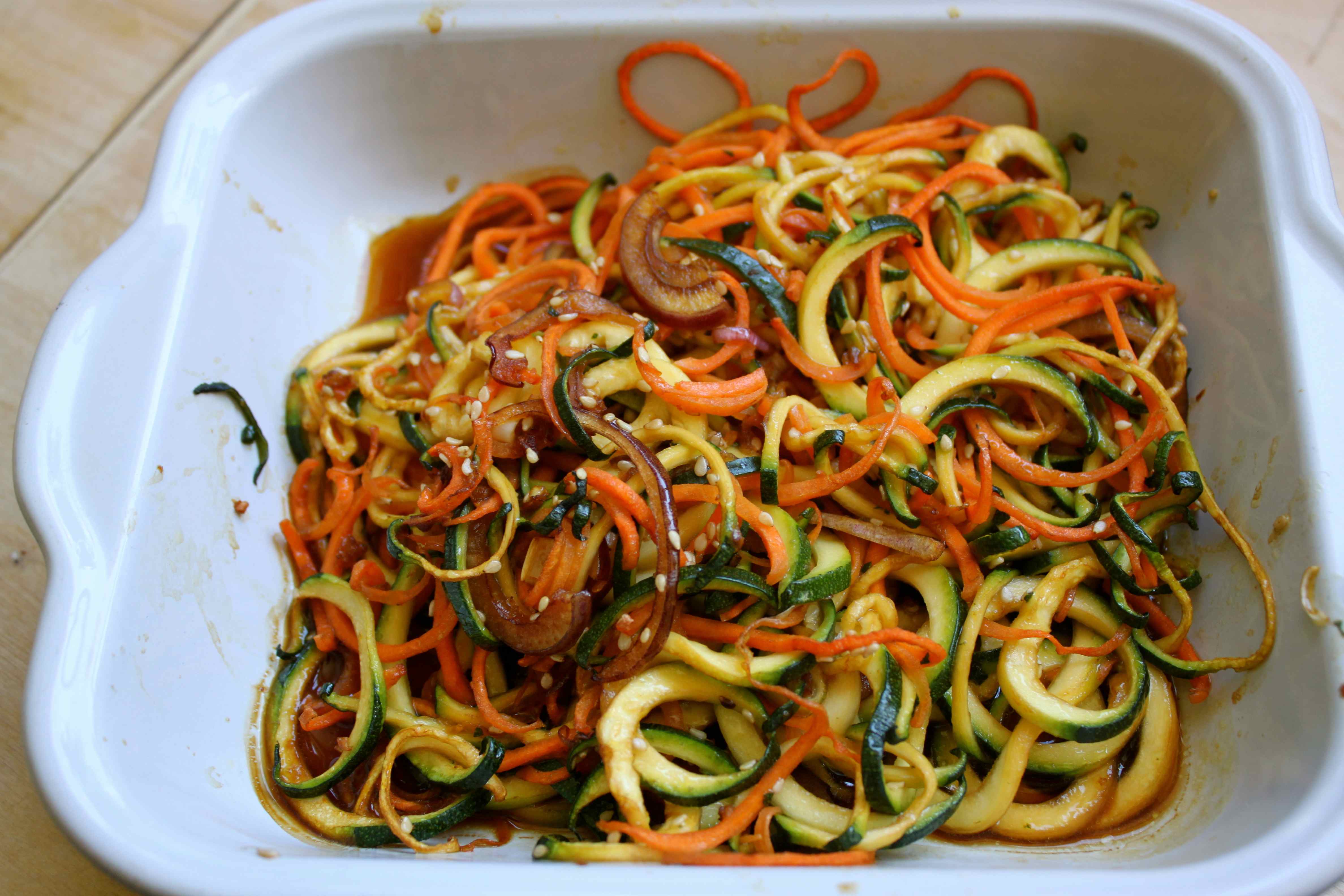 Lara was here for lunch and while I spiralled she made the dressing for the Asian Spiralled Vegetable Salad I fancied for lunch. This was inspired by Shazzie’s Oooodles of Nooodles recipe I found on her blog. No quantities were given so Lara estimated them.