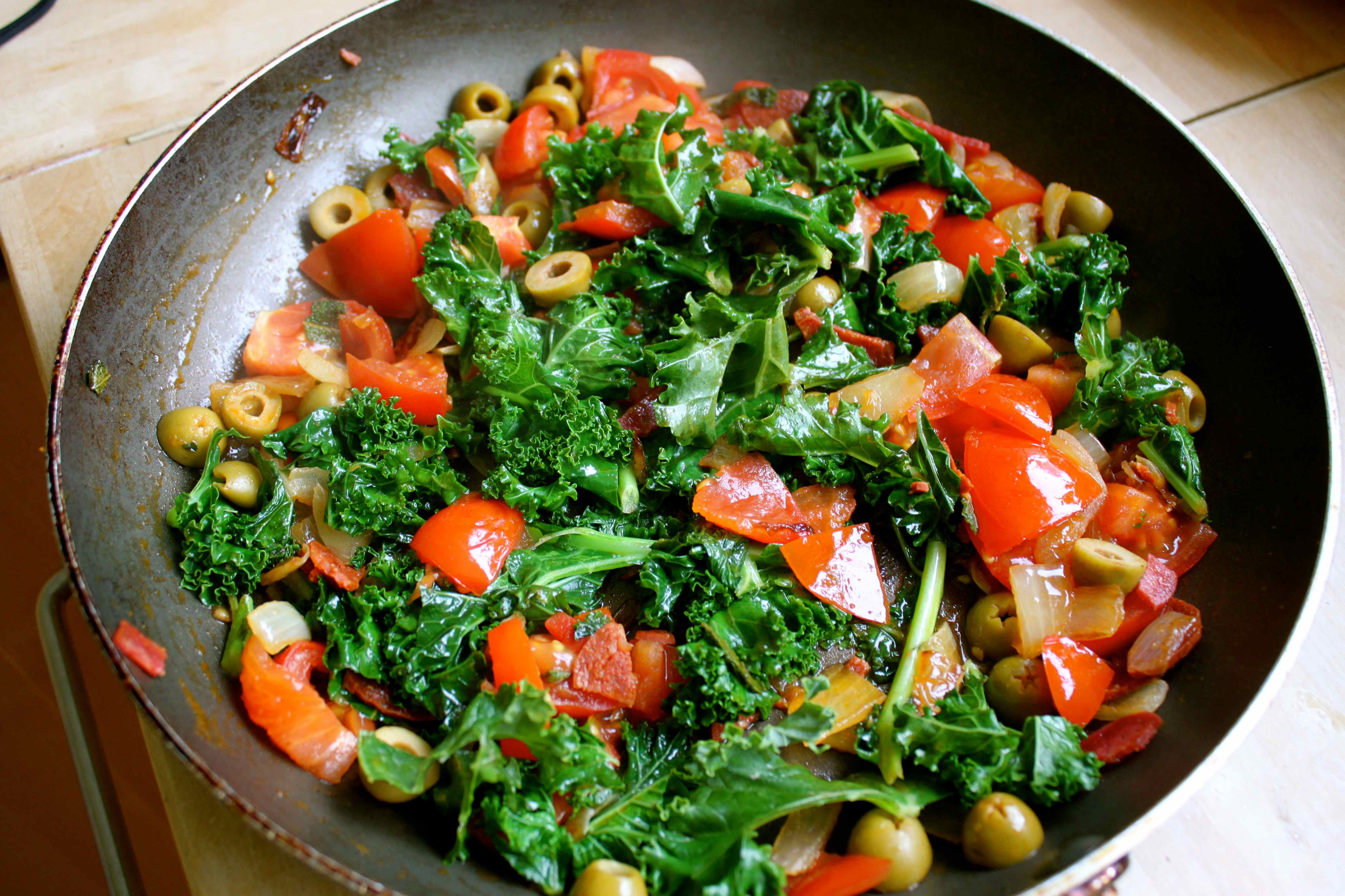 I had a packet of Tapas ingredients left over from Harvey’s birthday tea. There was some Salami, Pepperoni and lots of olives. I fried an onion, added the chopped up Tapas ingredients, 2 large tomatoes, a huge handful of kale and some fresh sage.