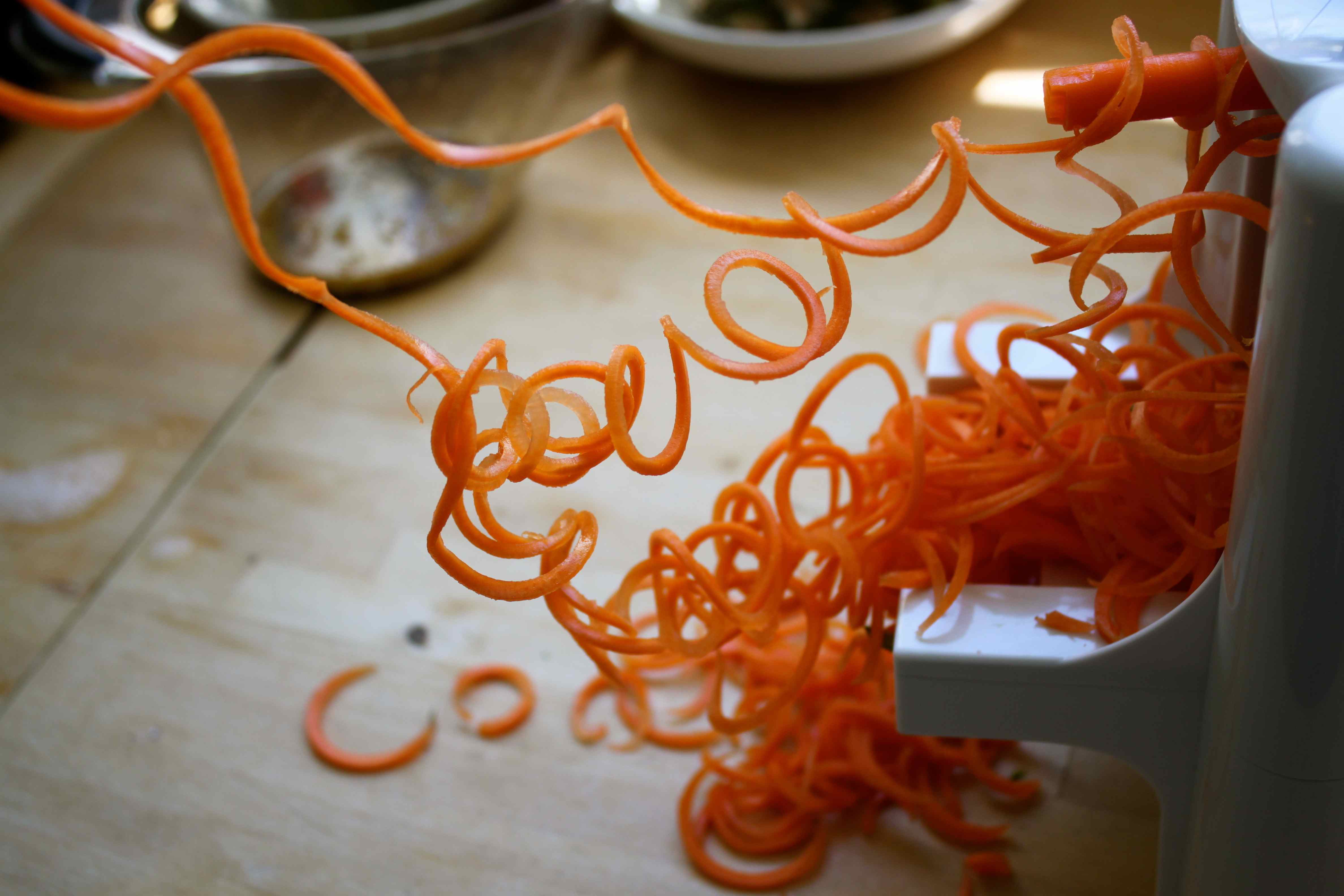 I wanted to use my new gadget again at supper time so I did! I showed Harvey how to spiral a carrot. You are left with a long stalk which he called “the mushroom” and asked if he could eat it. Yes my darling, you may eat raw carrot 🙂