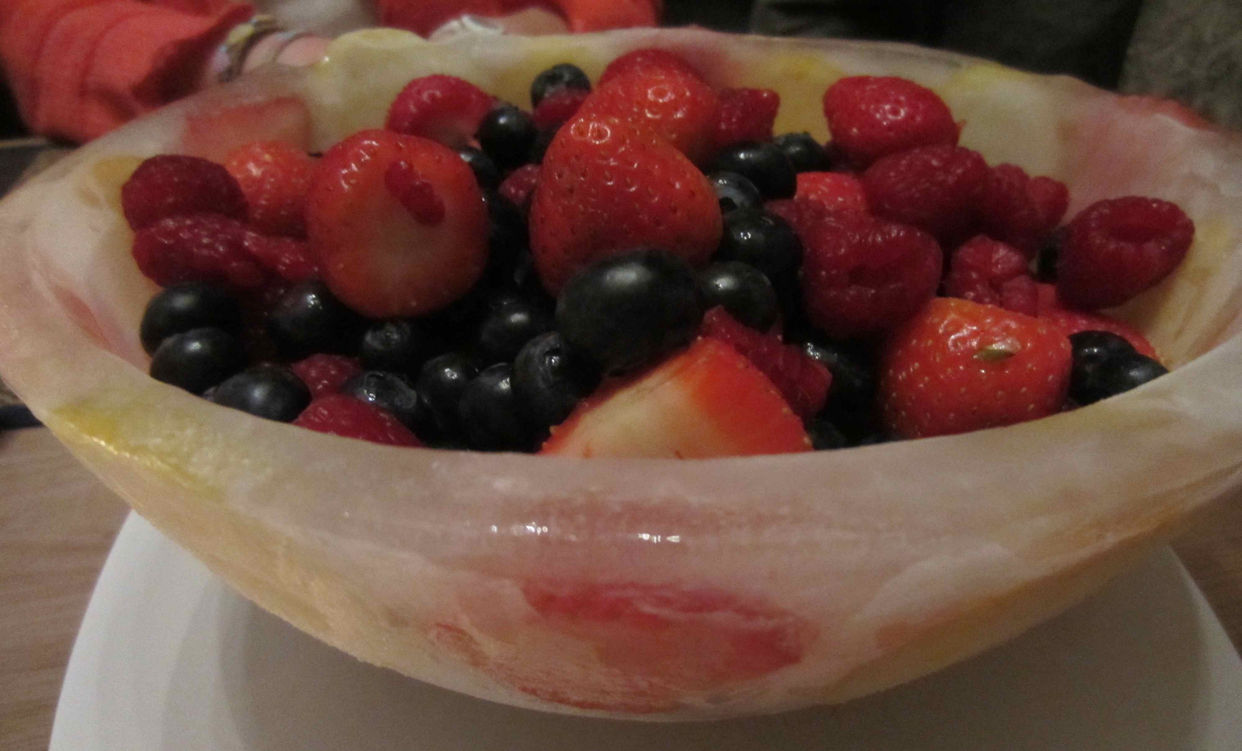 Ta Daaaa ! A spectacular ice bowl, with slices of fruit within the ice and filled with berries.