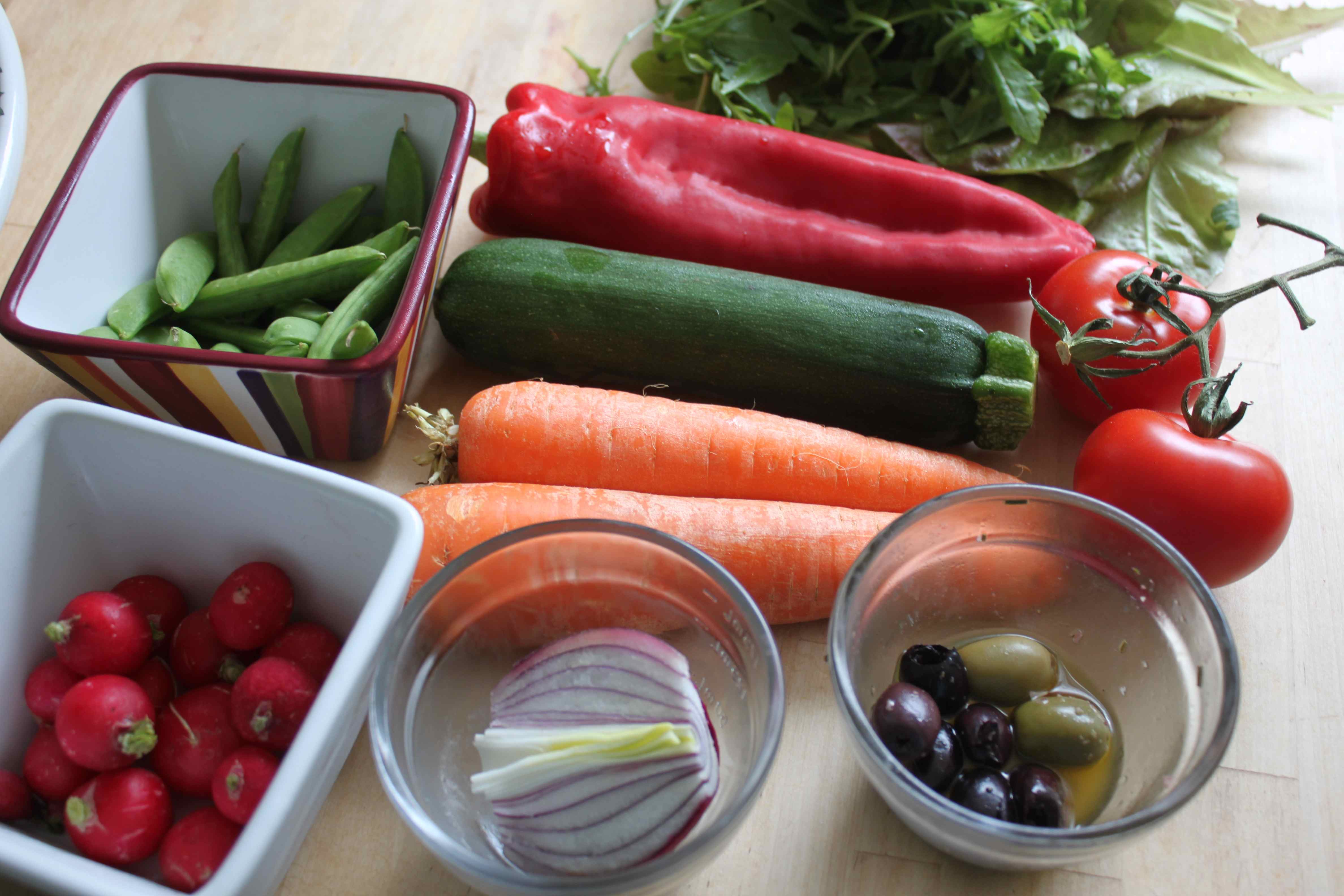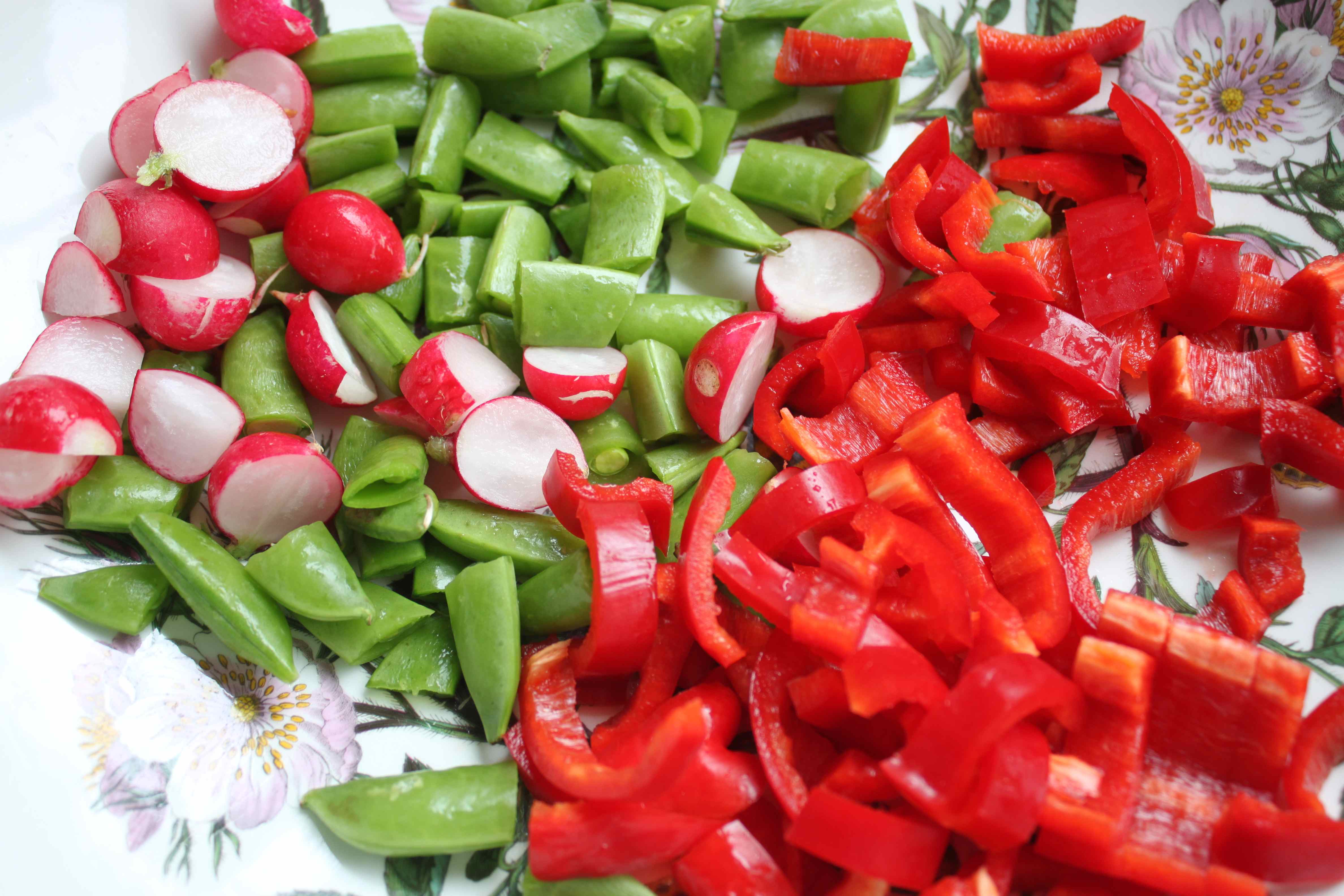 In to my huge bowl went sugar snap peas, red pepper and radishes.
