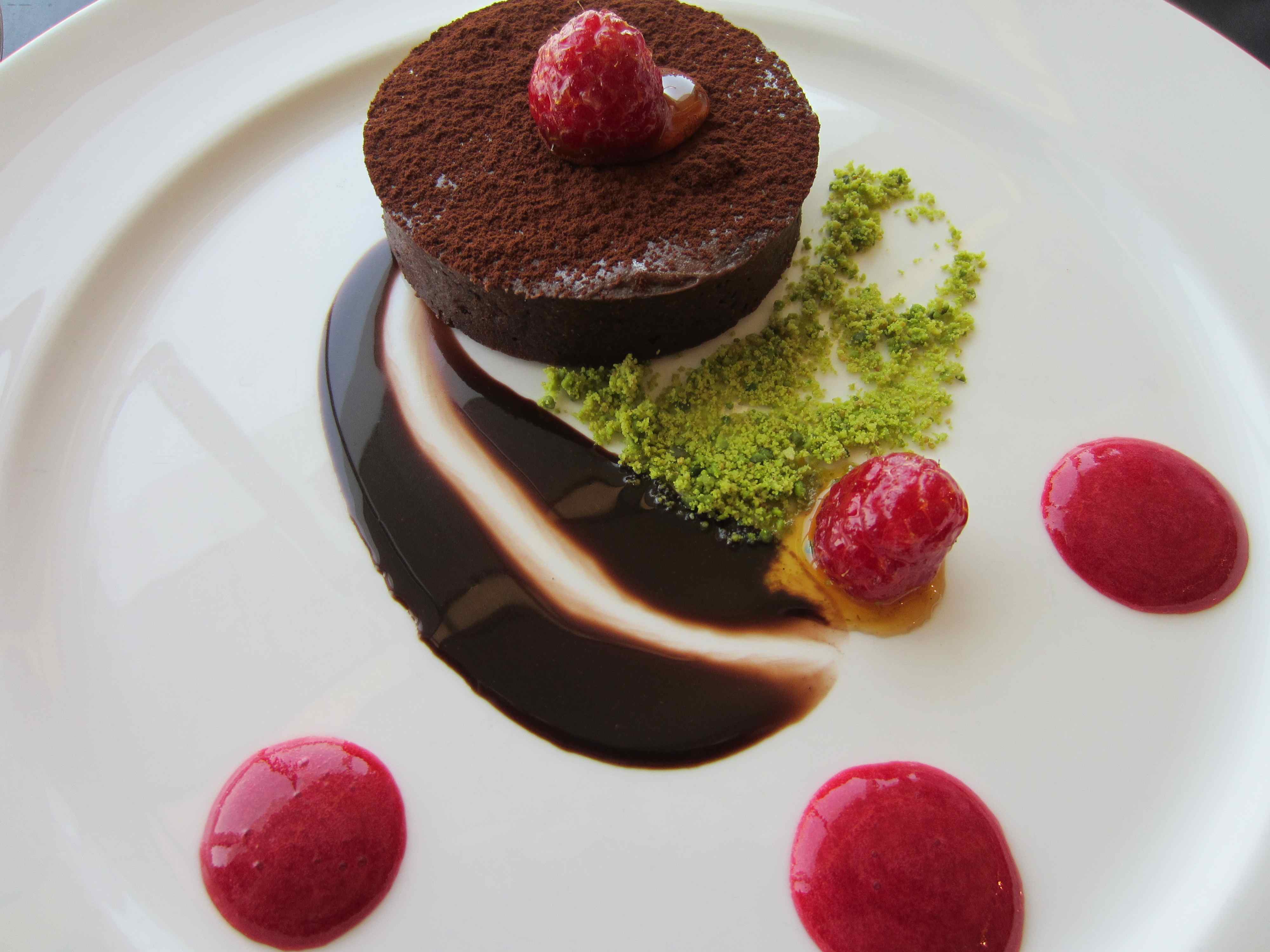 This dessert was extraordinary! Bitter chocolate and raspberry tart with pistachio crumble. The flan base was crunchy and light, the chocolate deep and intense and the raspberries sweet and juicy.