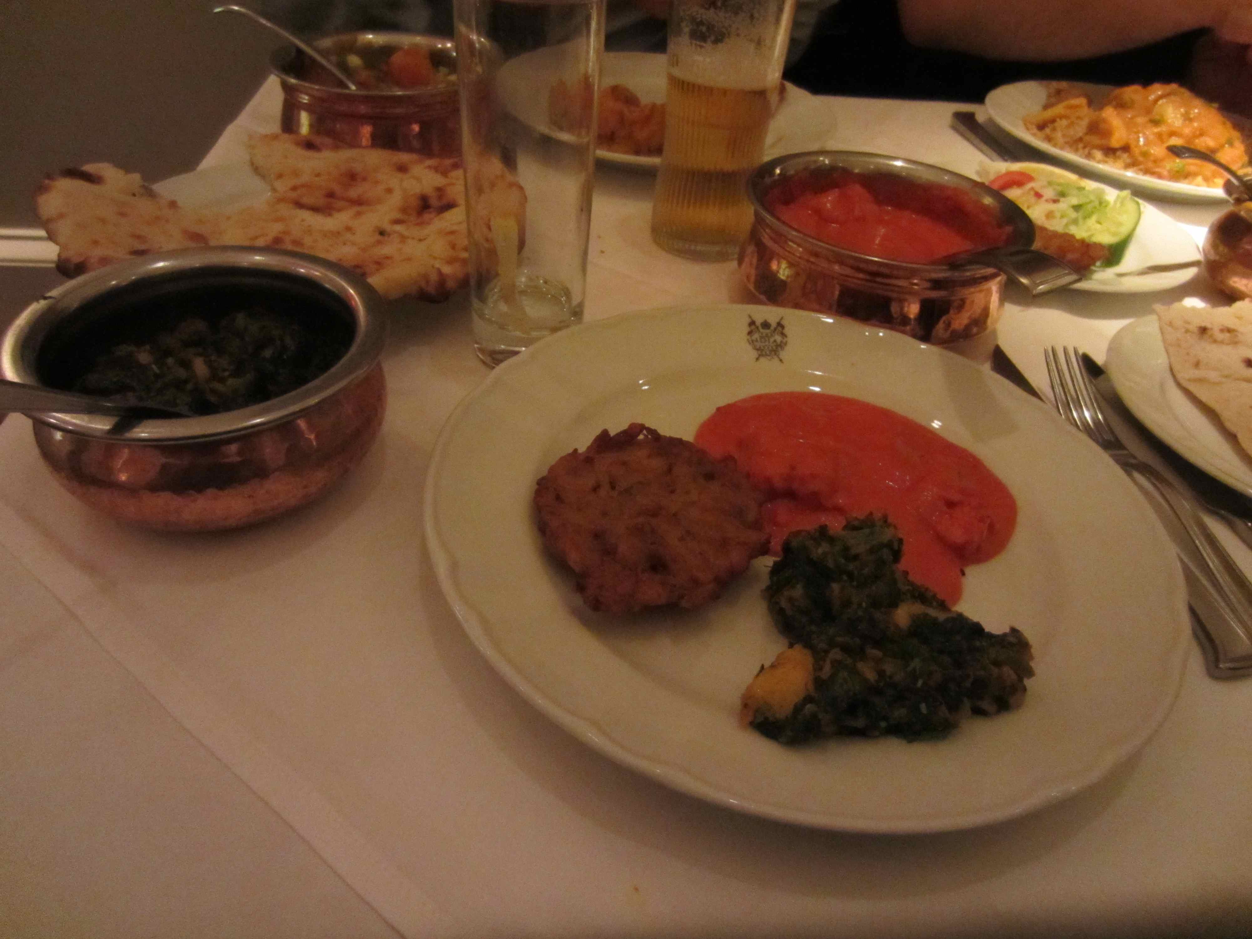 We had some excellent popadoms and then I tried a colleague’s cheese dosa. For my main I had a chicken curry called ‘Red Fort’ which was in a yogurt and almond sauce with Tandoori spices, a sag aloo (spinach and potato) and an onion bahji.