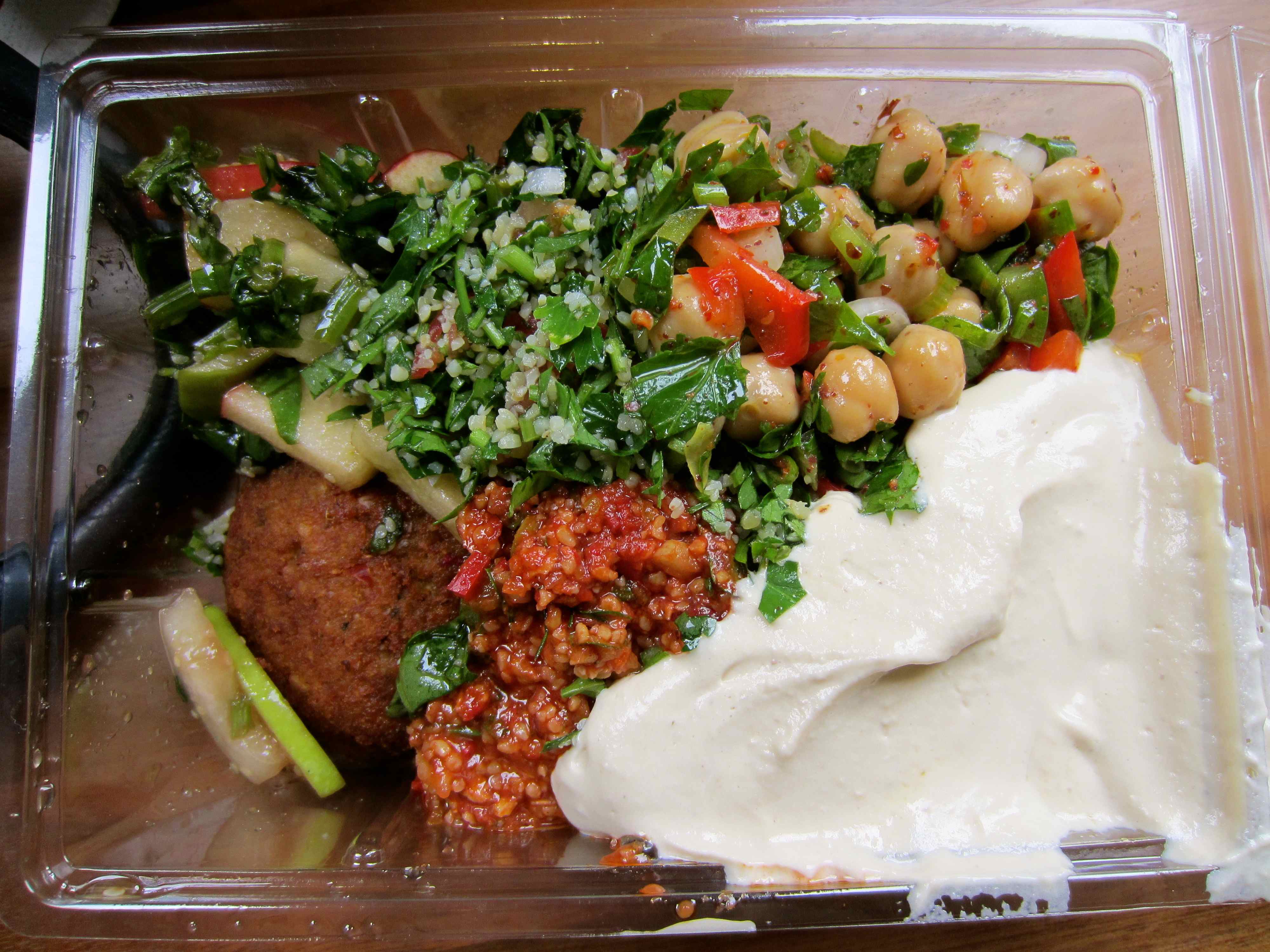 Final stop was TAS, the Turkish cafe. I chose a salad box with 6 selections in it: humous, falafel, tabbouleh, spinach and apple, chick pea and pepper and bulgur wheat, tomatoes and nuts which was fabulous. Such a delicious box of yumminess.