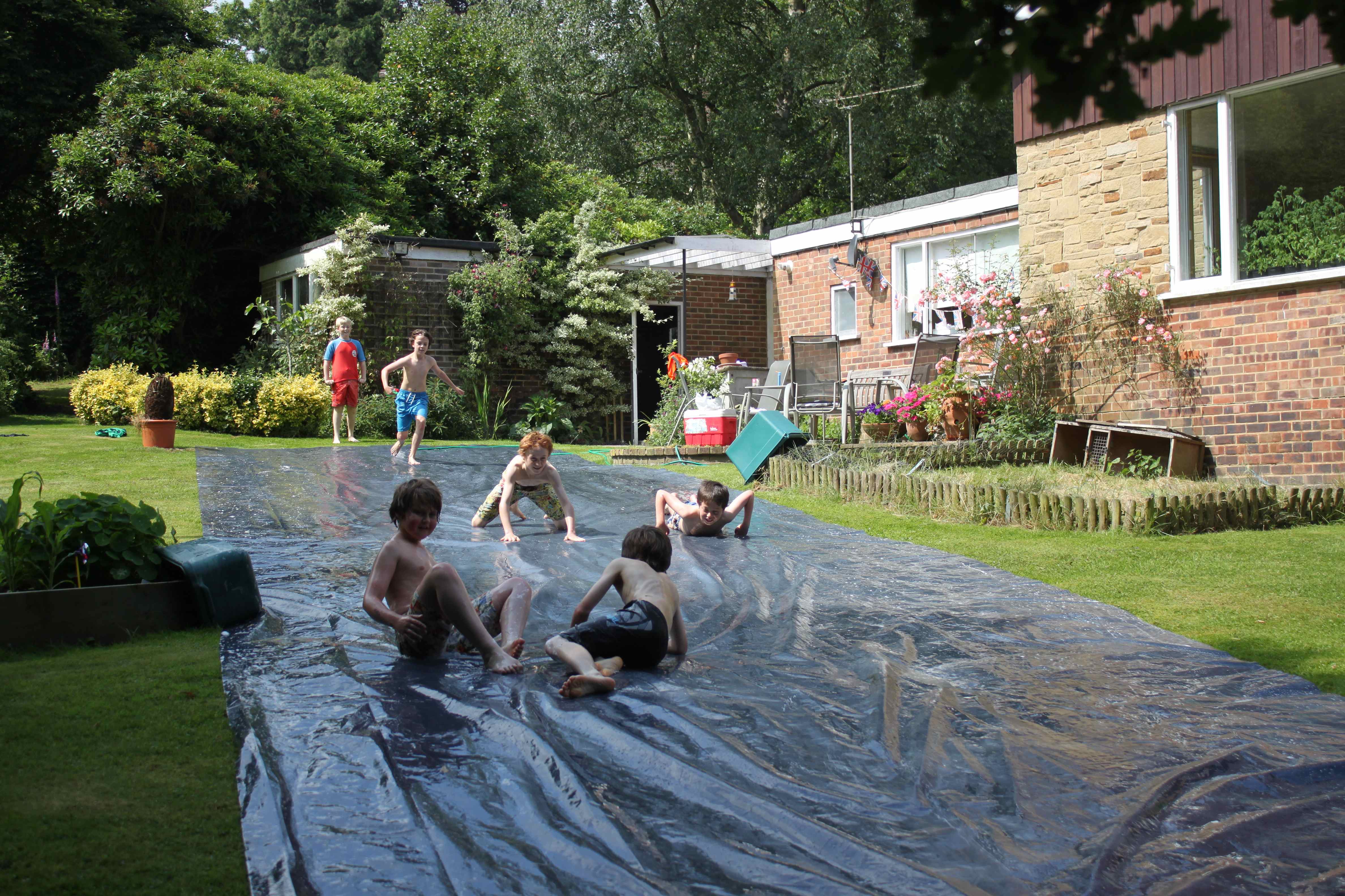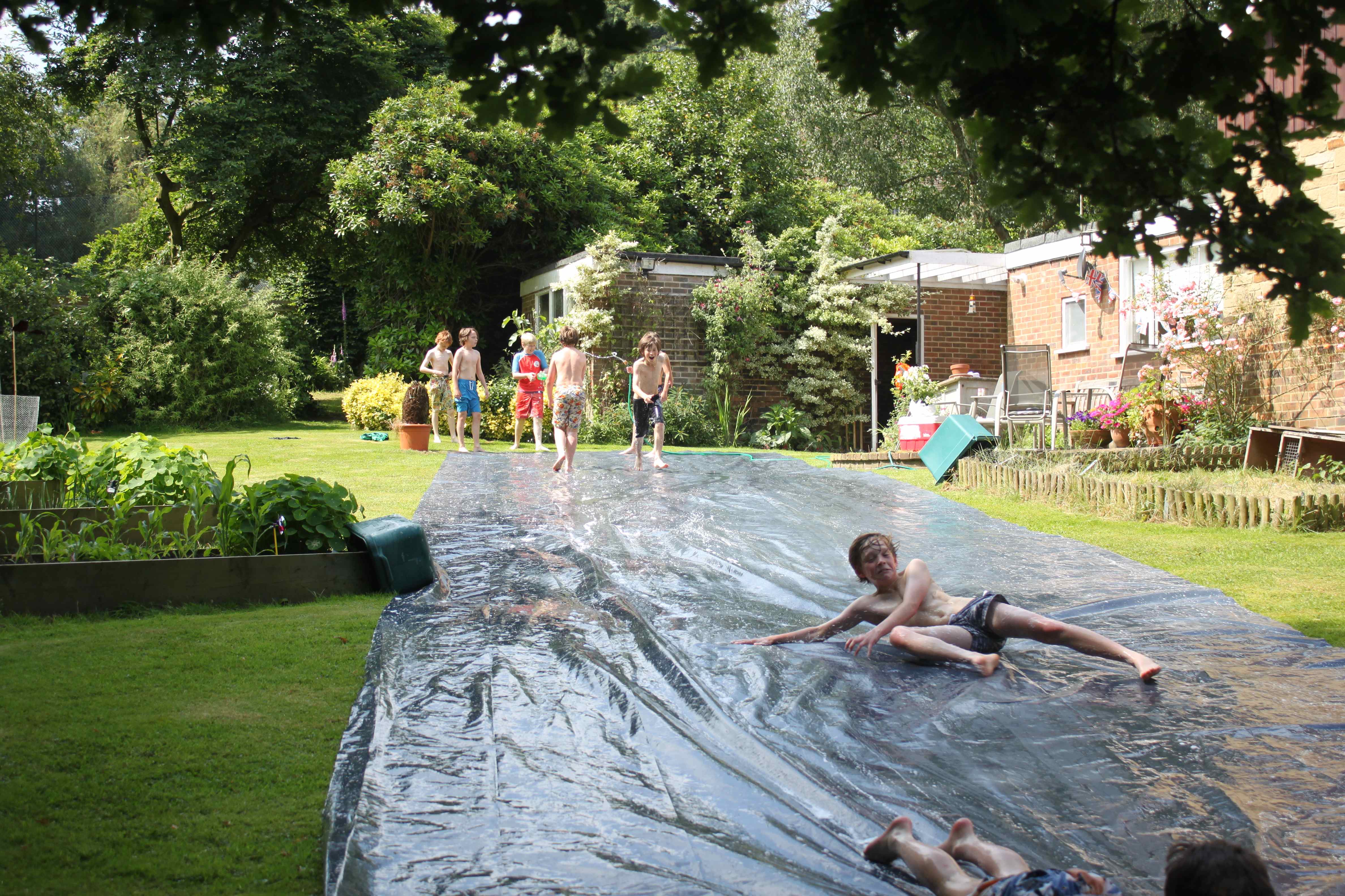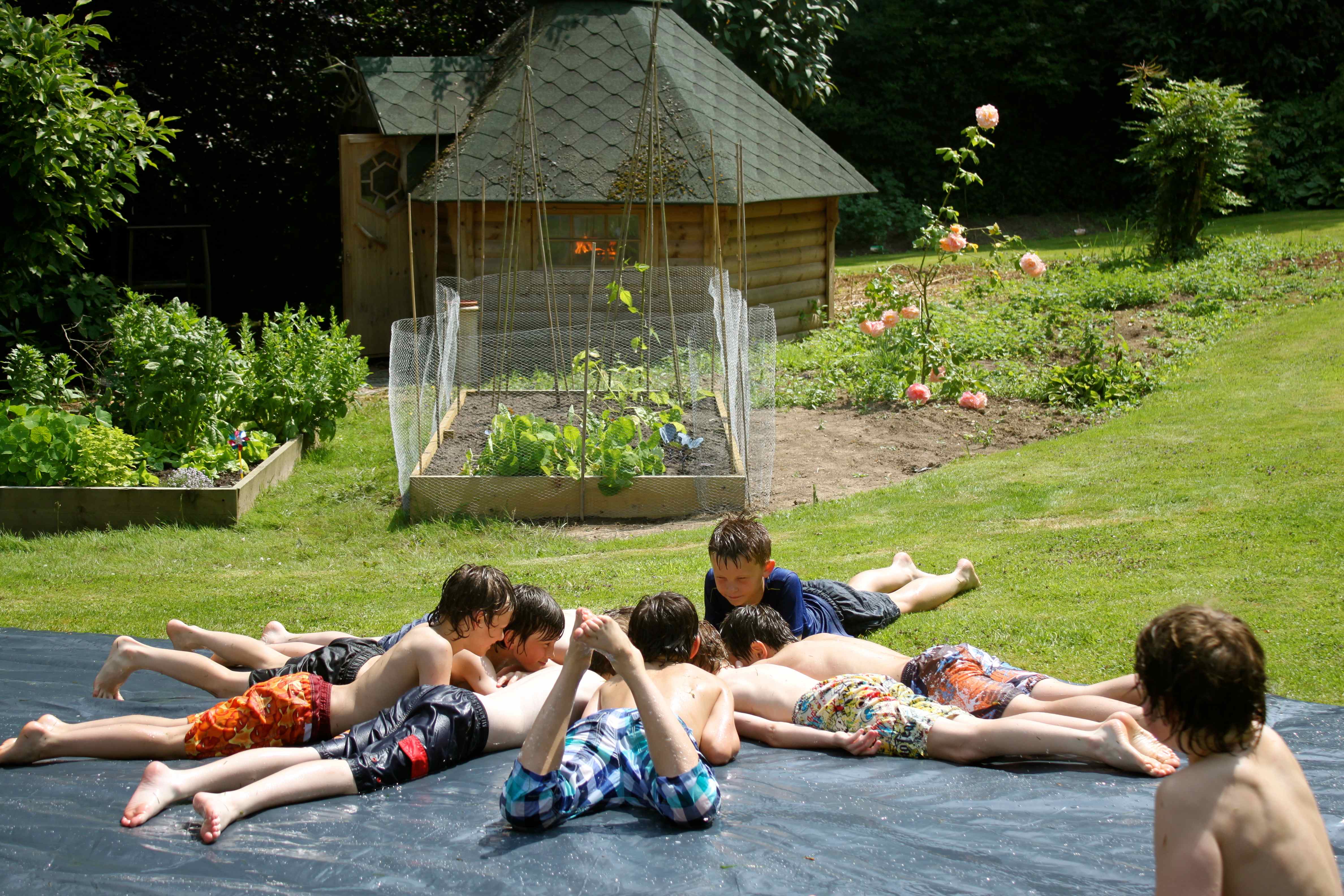 This large piece of waterproof membrane, washing up liquid and a hose, kept 12 boys amused for many hours.