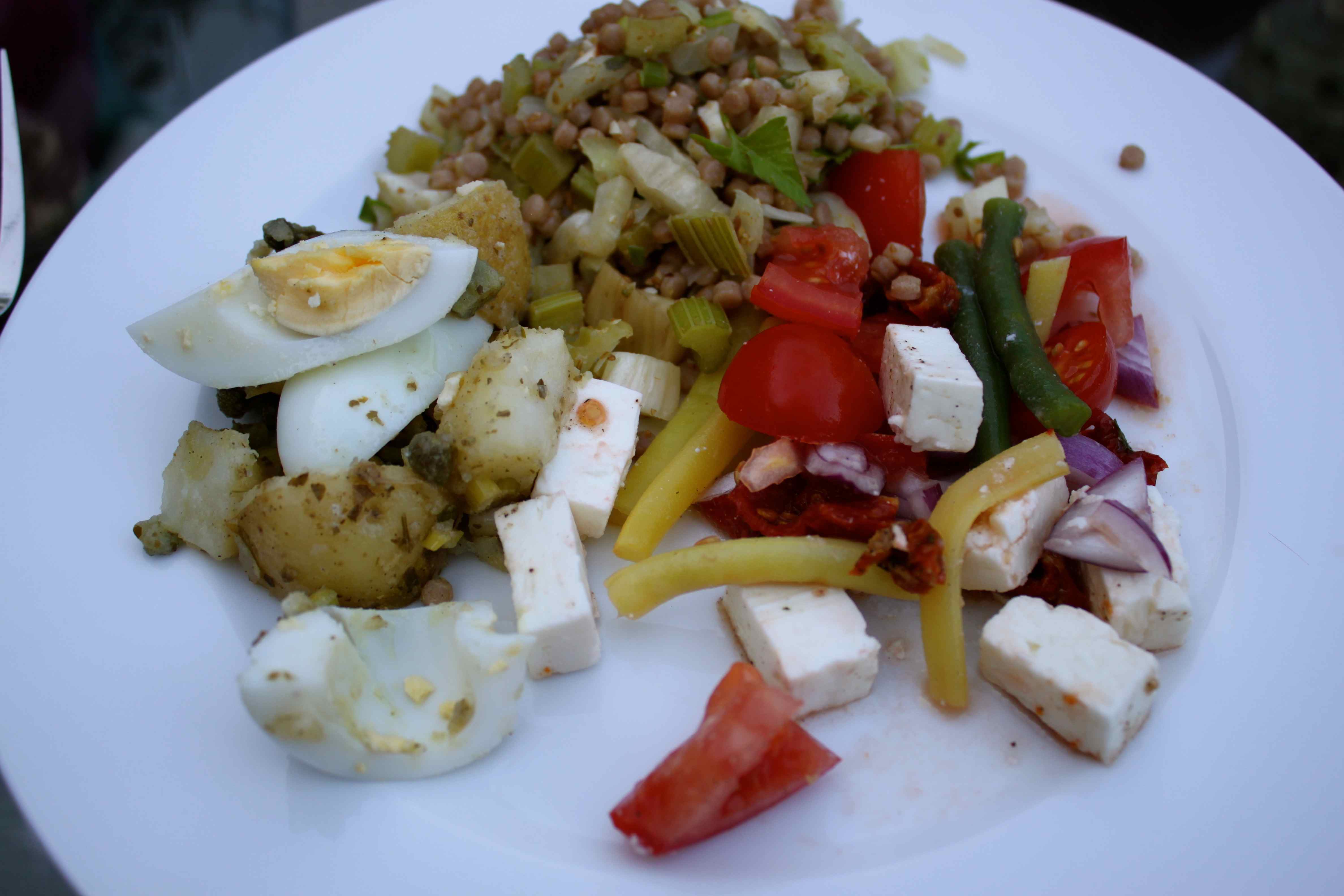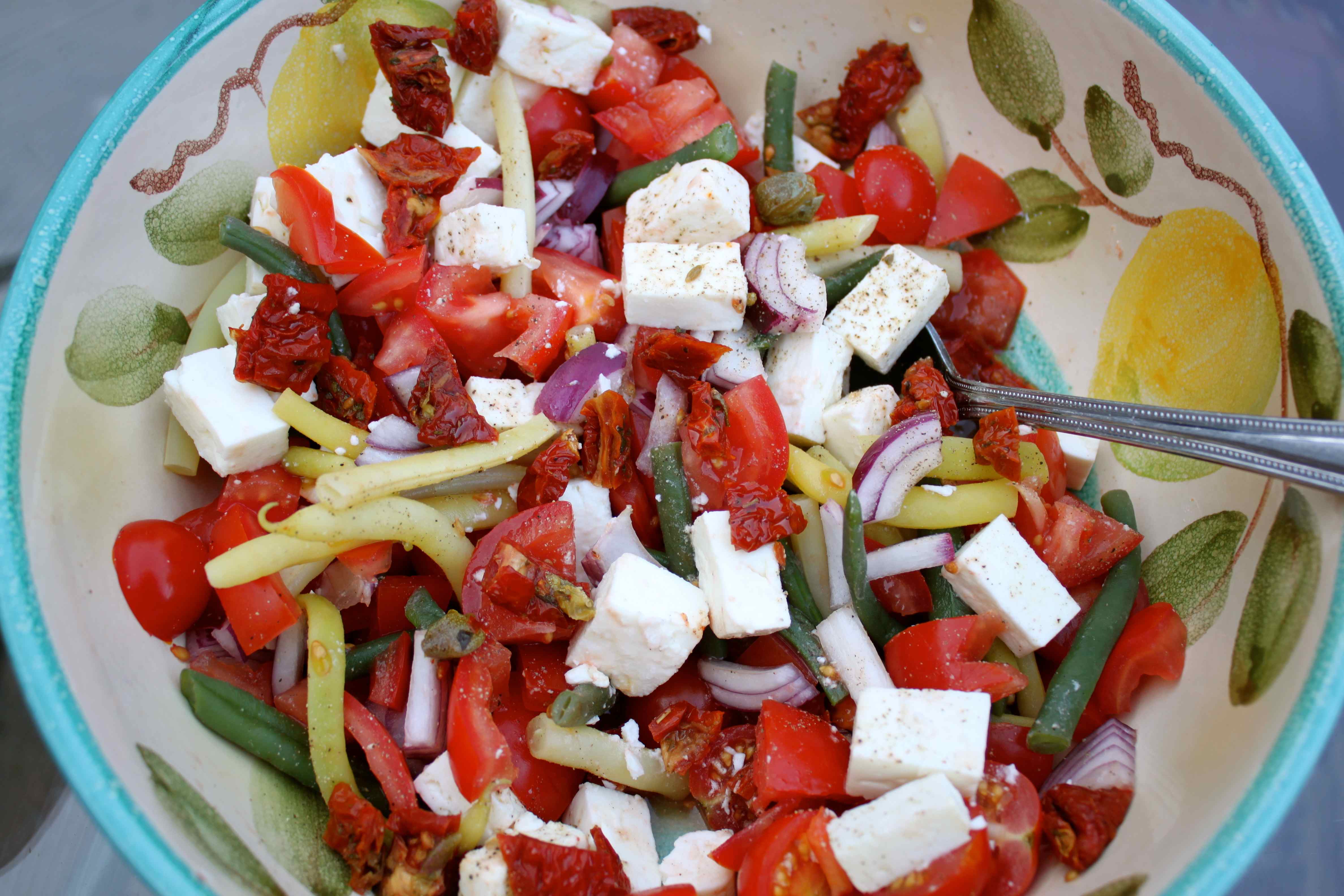 A kind of Greek Salad, made with tomatoes, red onion, cooked and cooled green and yellow beans, sundried tomatoes and Feta cheese. I serve the cucumber separately as James hates it but the rest of us like it.
