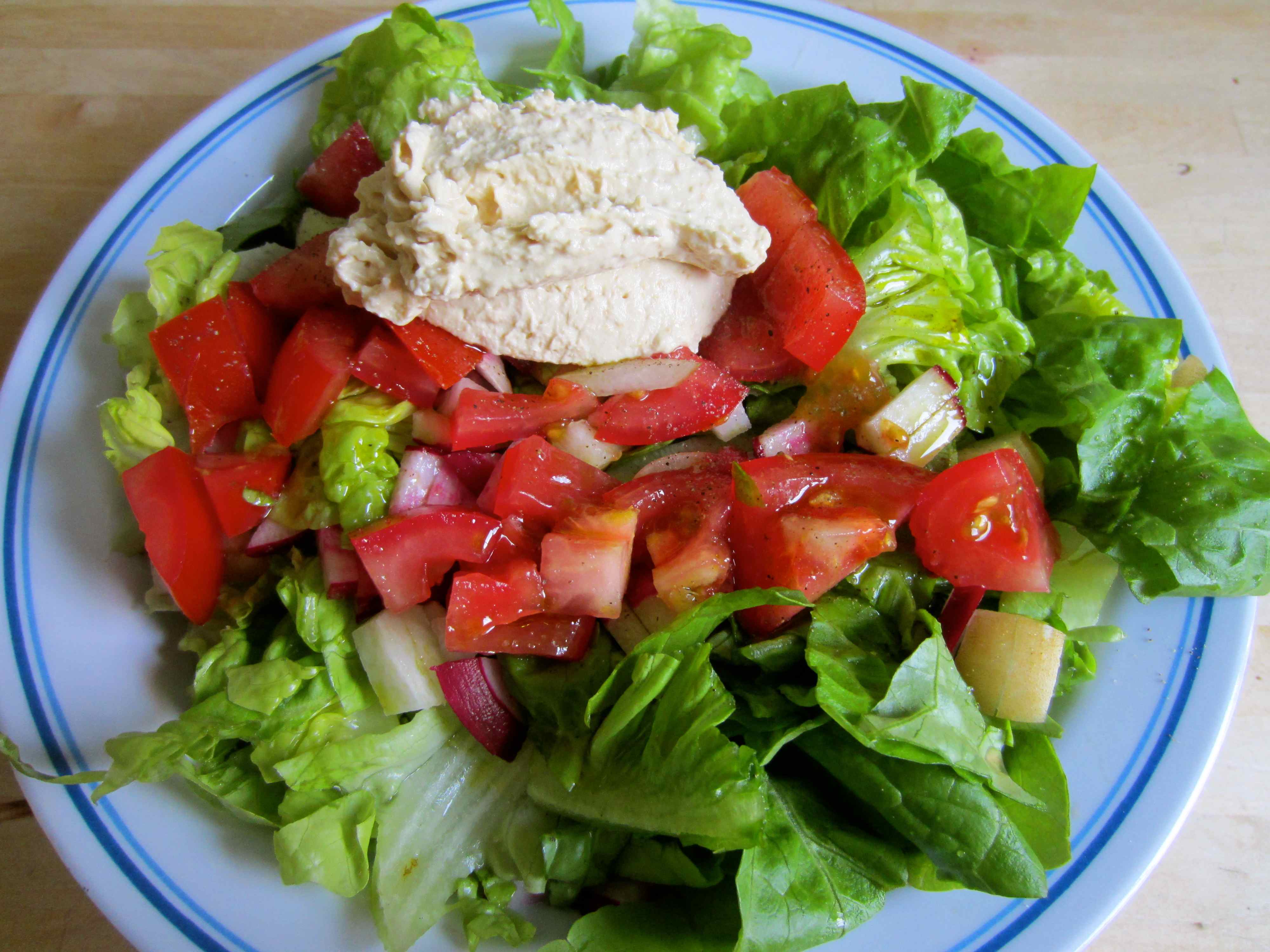 Served with 2 radishes, tomatoes, avocado oil and a large dollop of humous. Perfect.