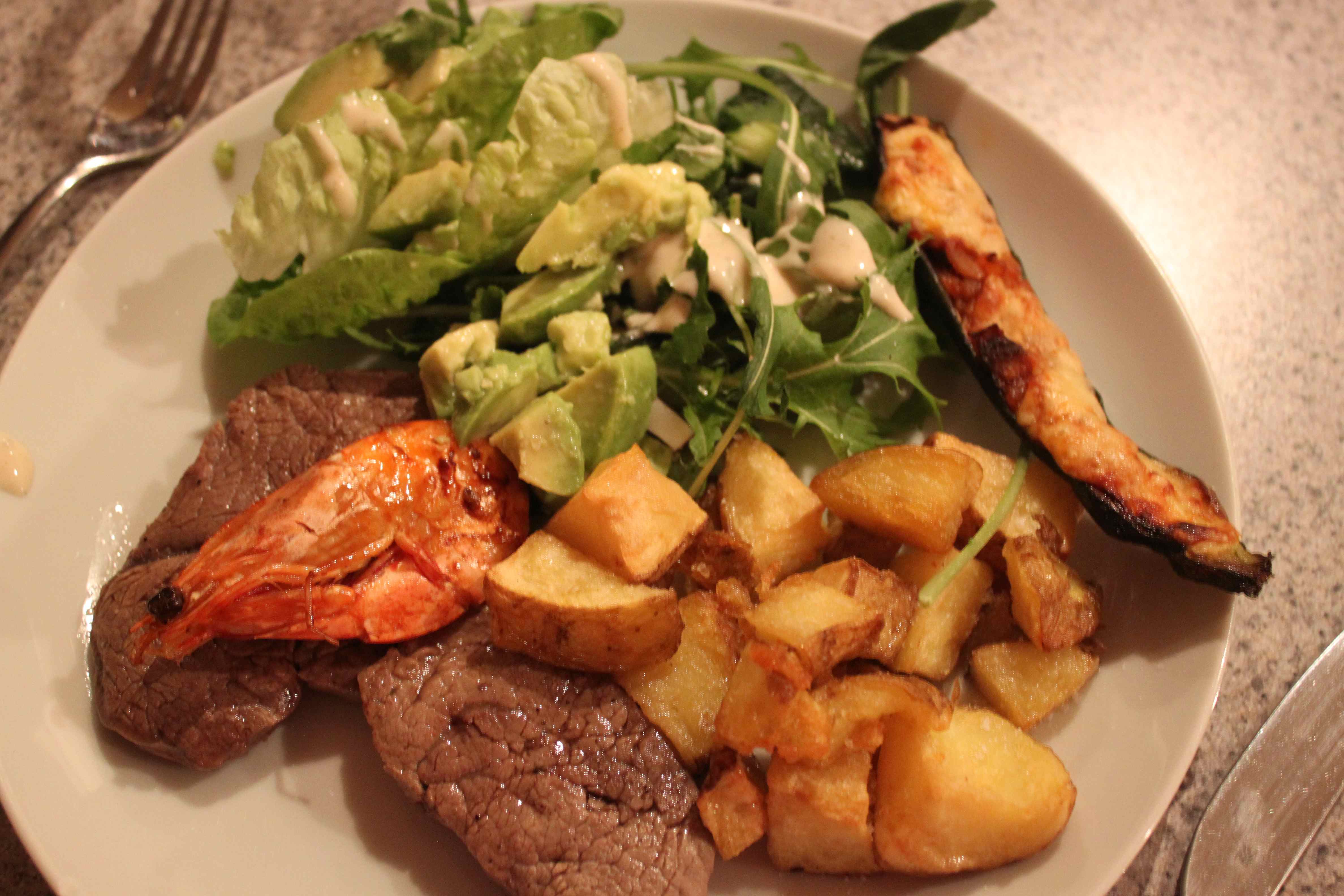 Bex made these lovely courgette, rissotto and cheese slices which I will attempt to recreate when I get home and harvest my courgette crop.cheese and risotto and courgette She also made a salad and roasted potatoes and Guy cooked delicious fillet steak and King Prawns.  This was all enjoyed with a cold New Zealand Sauvignon Blanc.  Quite perfect.surf and turfFollowed by a chocolate biscuit.
