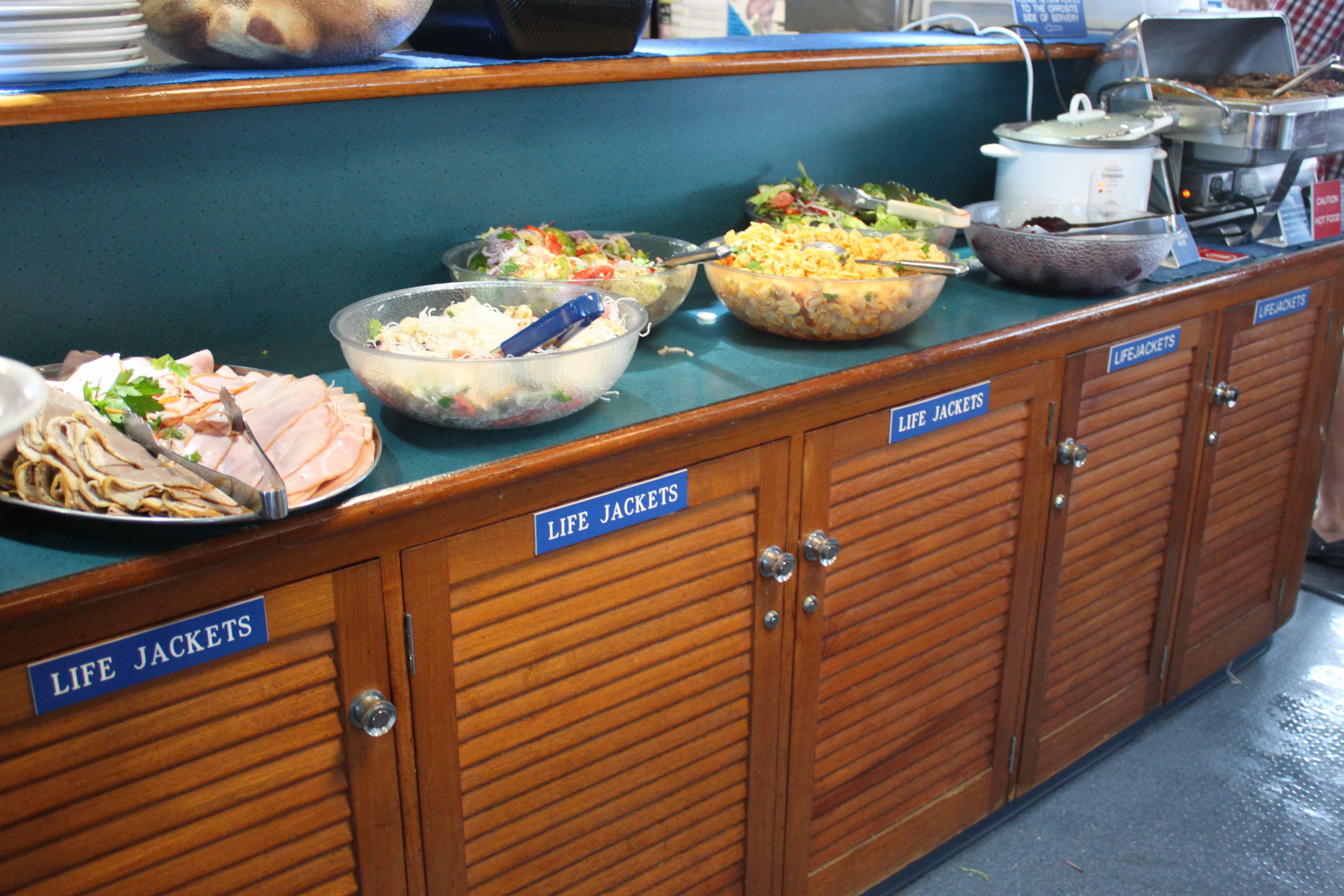 Lots of king prawns and chicken, hams, salads plus hot courses and soup.