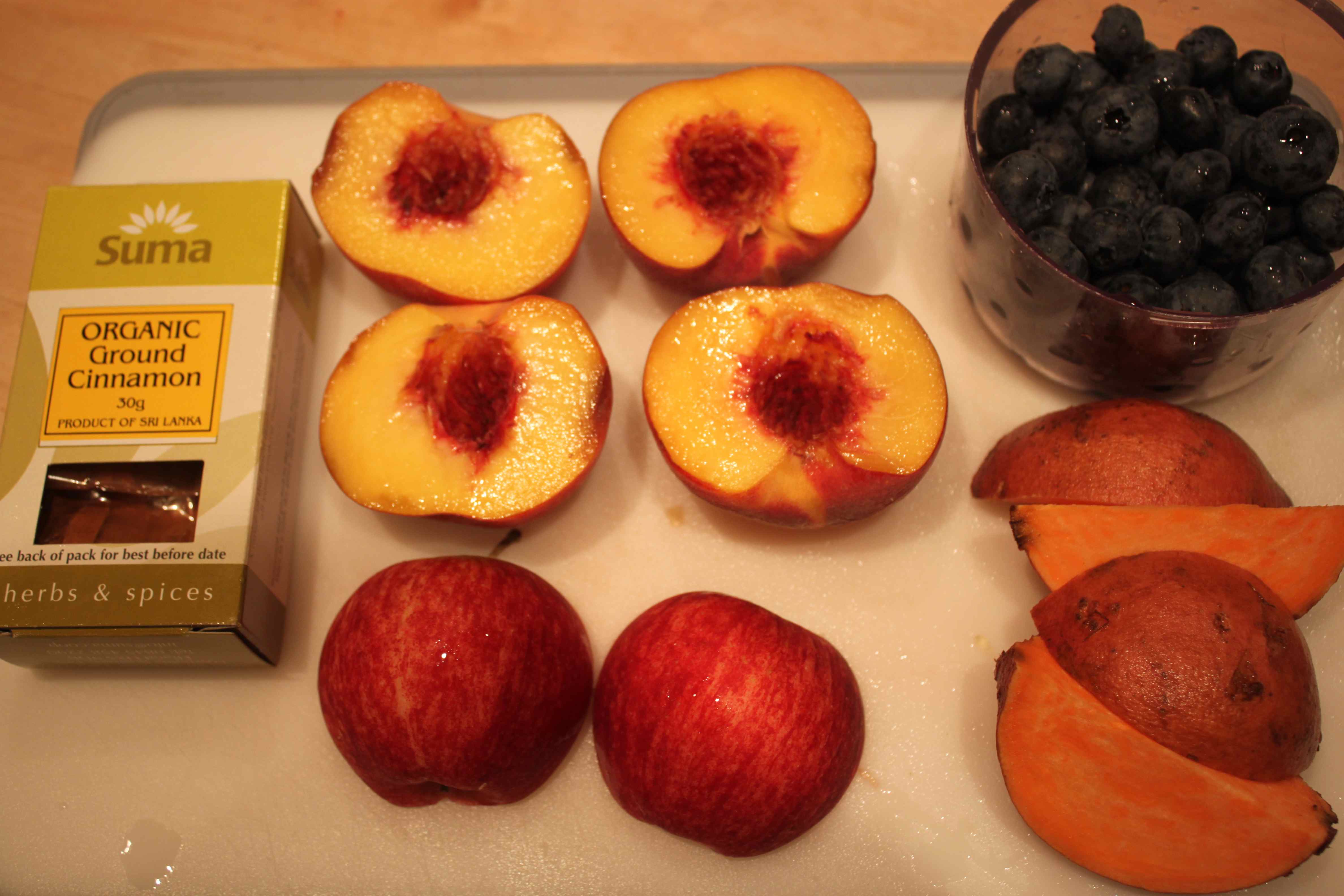 The first thing to consume was a mug of hot water with lemon juice.  Exciting stuff!hot water and lemon Juice 1 of the day was ‘Sunrise’ i.e. the juice of 2 oranges, 4 carrots and 1 beetroot.carrots etc What a glorious colour it was.  A stunning purple/orange colour.  The pattern in the juice is from the light reflecting from the window, not some strange combination of colours mixing in the juice.beetroot juice Mid morning was a glass of coconut water.coconut water 2-9-13 Lunch was a glass of green juice.  I chose the ‘Mean Green’ which I made with 6 small Swiss Chard leaves, 1 cucumber, 2 stalks of celery, 1 apple, half a lemon and some ginger.green juice 2 2-9-13 It tastes OK if I drink it over lots of ice but I confess it does make me gag a bit at room temperature.green juice 2-9-13 “Supper” was much later than intended as I was out collecting Harvey which involved rather a lot of chatting (how unusual 🙂 ) so I was actually very hungry for my ‘Garden Variety’.  The recipe asked for 2 cucumbers but I think 1 was plenty.  The greenery was a round pointed cabbage and some kale.cabbage etc 2-9-13 I ended the day with a purple juice called ‘Peach Delight’.  Made with 2 ripe peaches, a cup of blueberries, an apple, a sweet potato and a pinch of cinnamon.  This was actually magnificent.  Genuinely it was and I don’t think that was my starved body being deluded in to thinking this was delicious.  It was sweet and the cinnamon made it taste like a pudding.  I can’t wait to have another one of these.  Actually, I will have to because I don’t have any more peaches but I am definitely buying some!purple 2-9-13