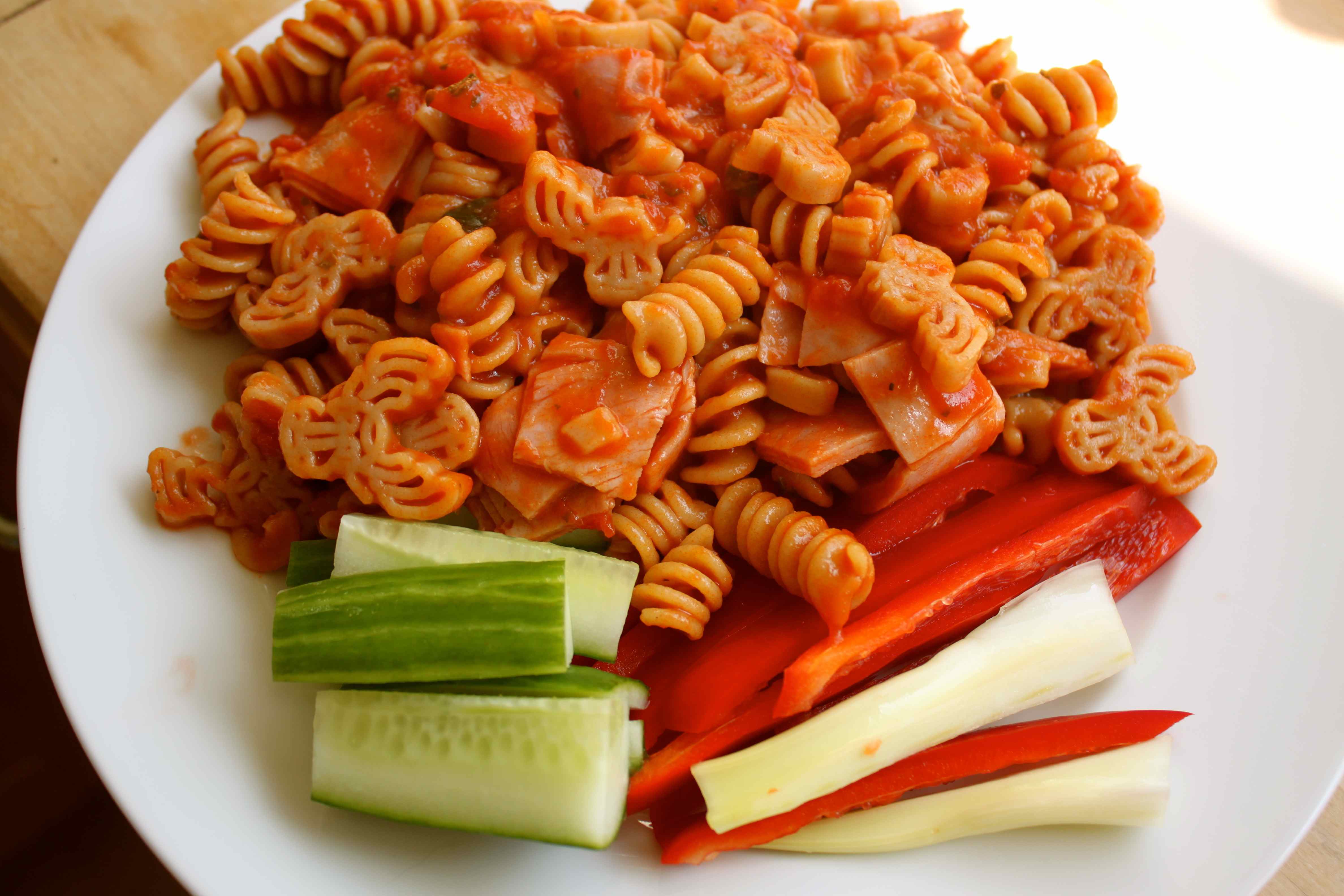 For lunch Harvey had a plate of wholewheat pasta and ham in tomato sauce with some red pepper, cucumber and celery on the side. I am not a big fan of pasta so I found this quite easy to resist.