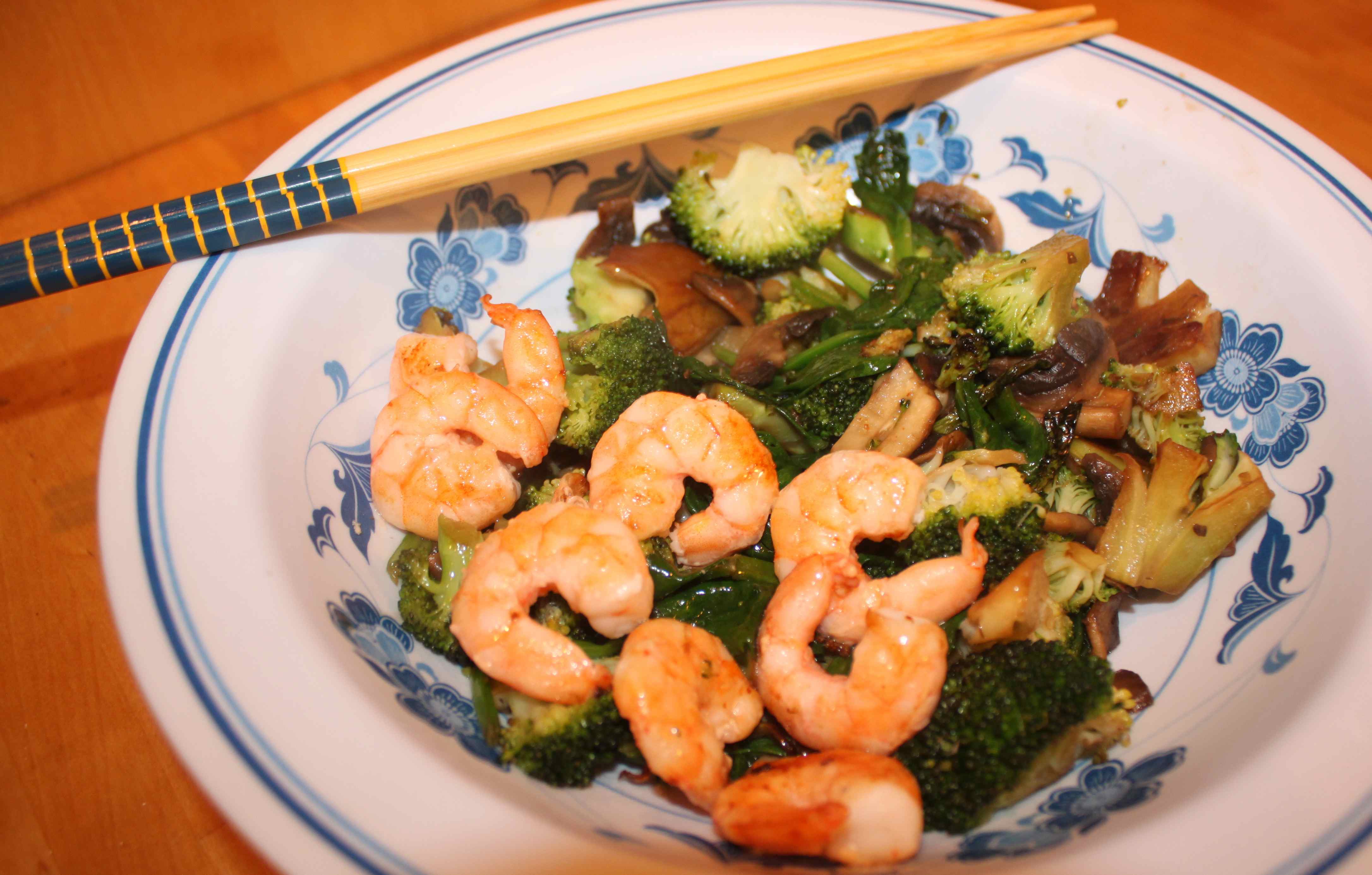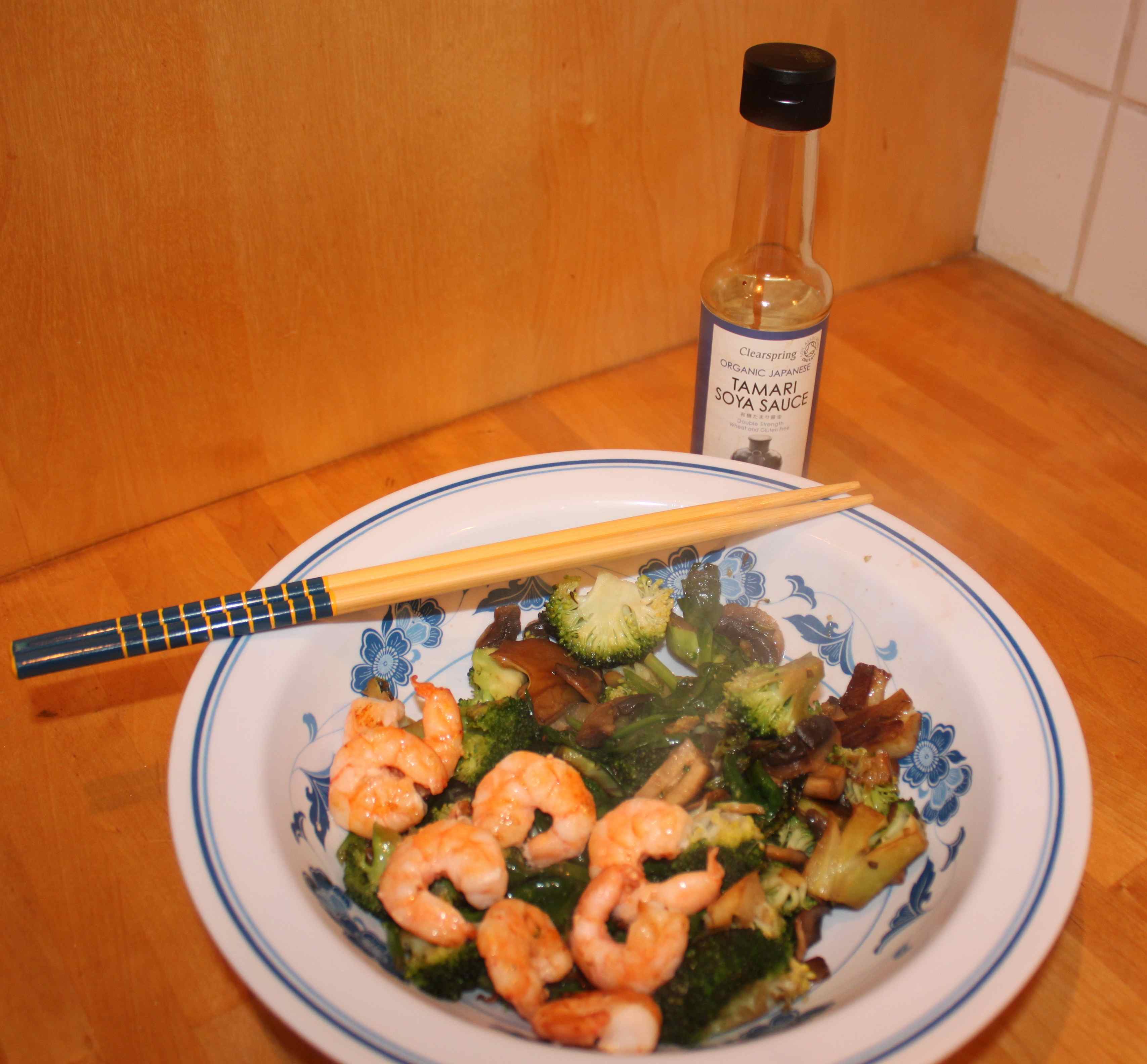 I stir fried some broccoli, mushrooms and spinach and then added prawns and a dash of Tamari. Job done.