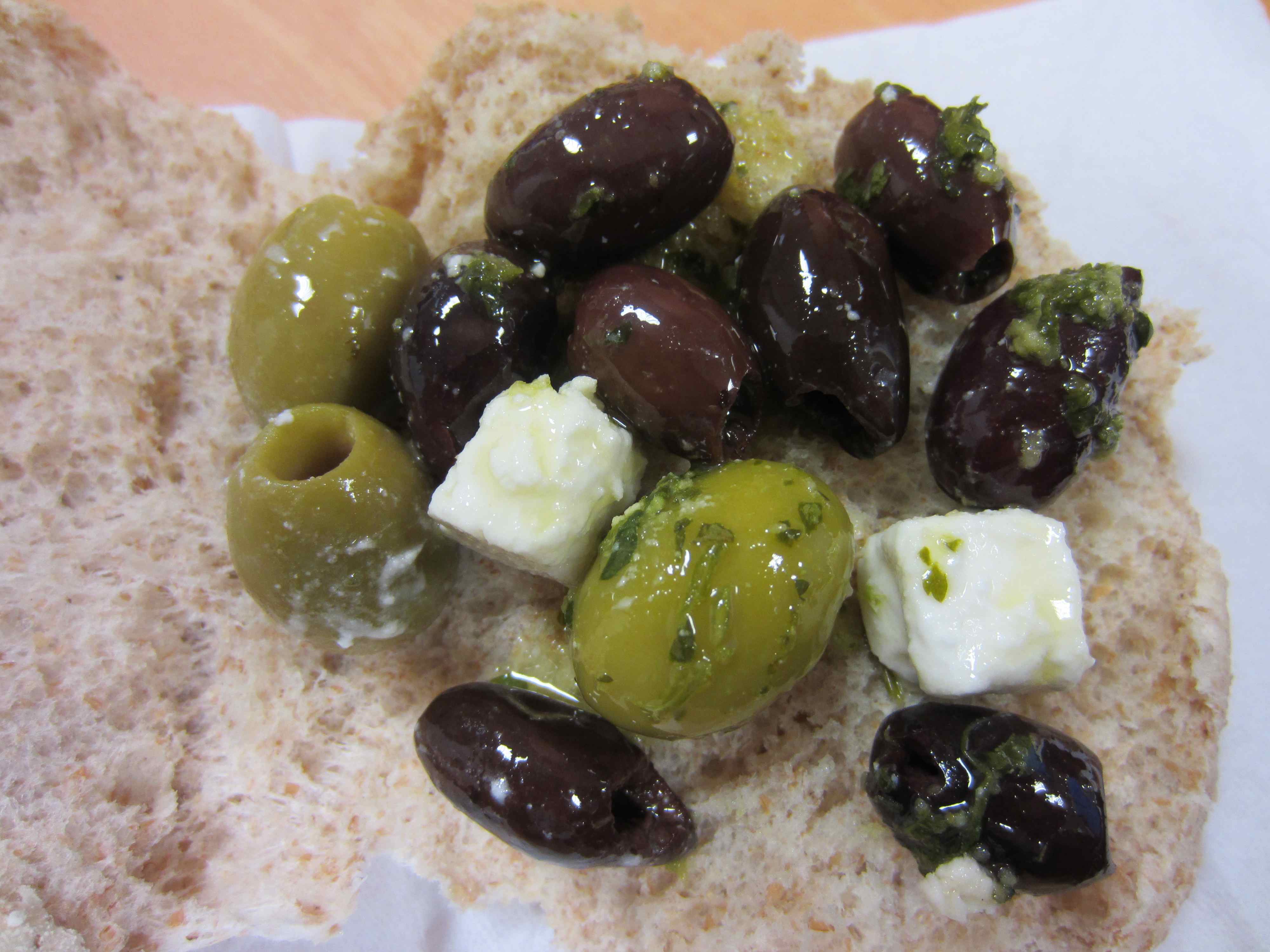 What would I do with those olives? They were too salty on their own so I used a wholemeal bap to make an olive and Feta roll. I had bought a packet of 4 baps to take home but I rather enjoyed one with the olives and Feta.