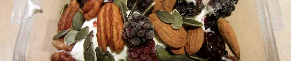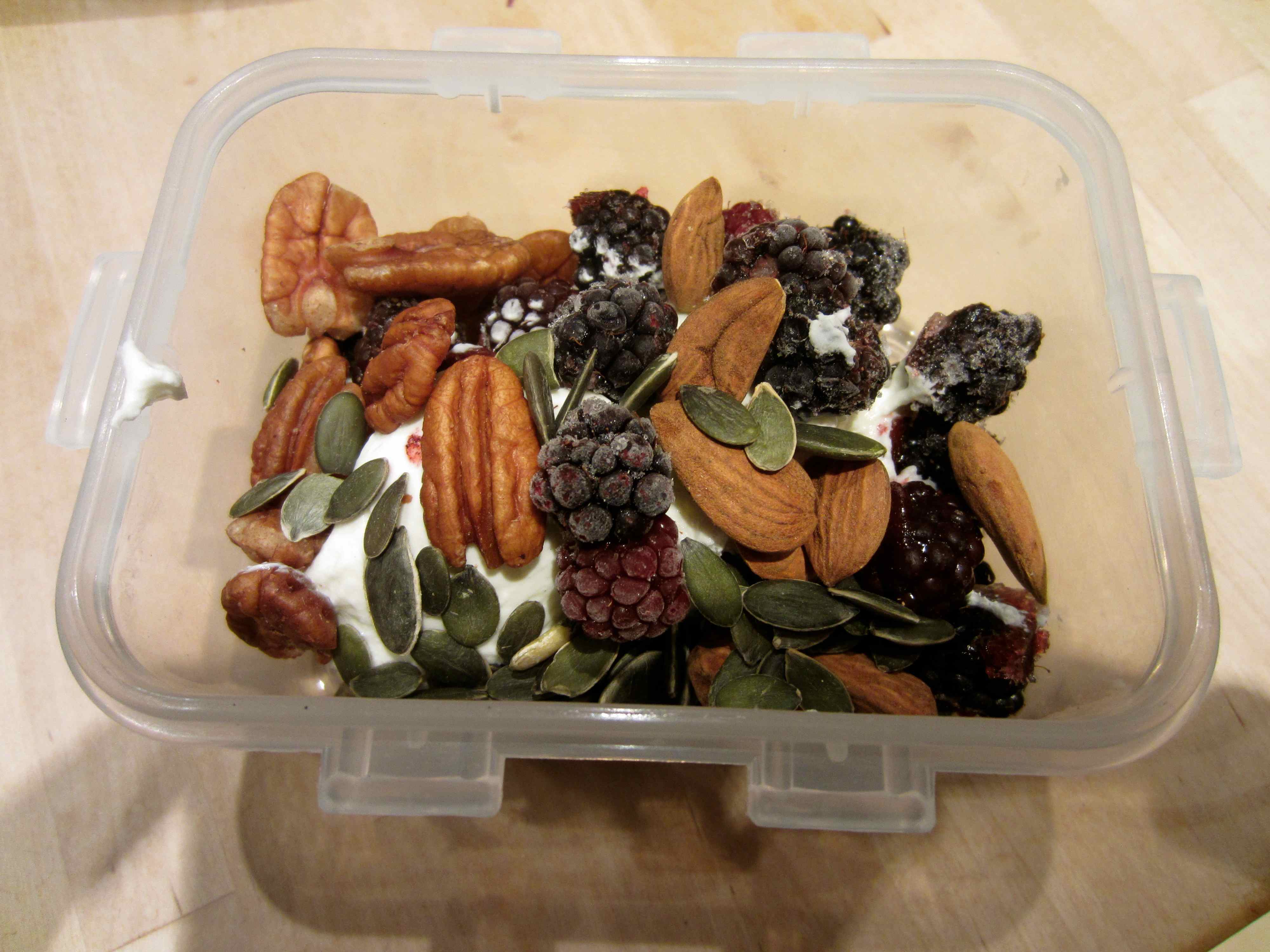 For breakfast I made a very modest sized portion of natural yogurt with some blackberries Harvey and I picked in September (and then froze) with just a few pecans, almonds and pumpkin seeds.