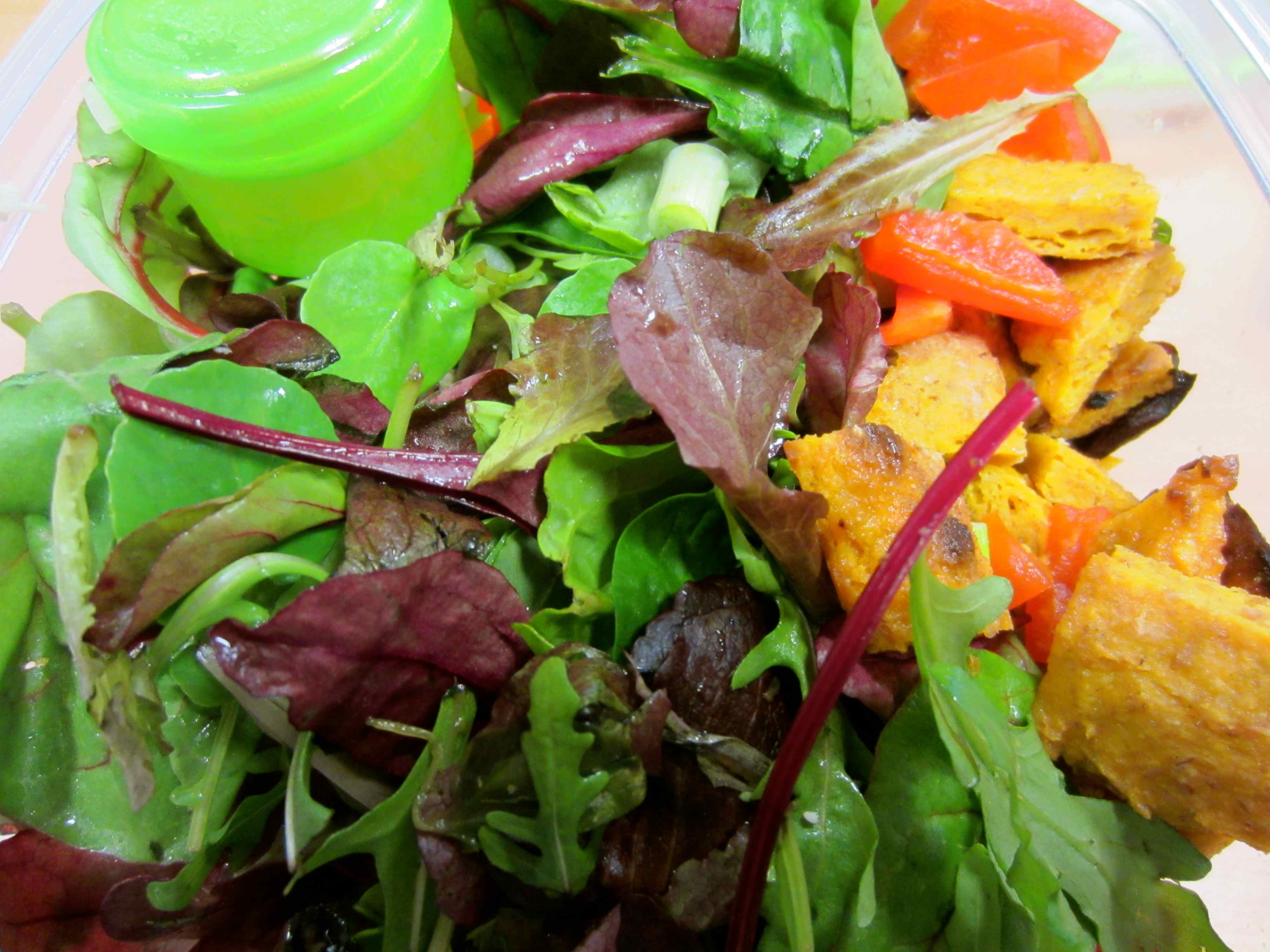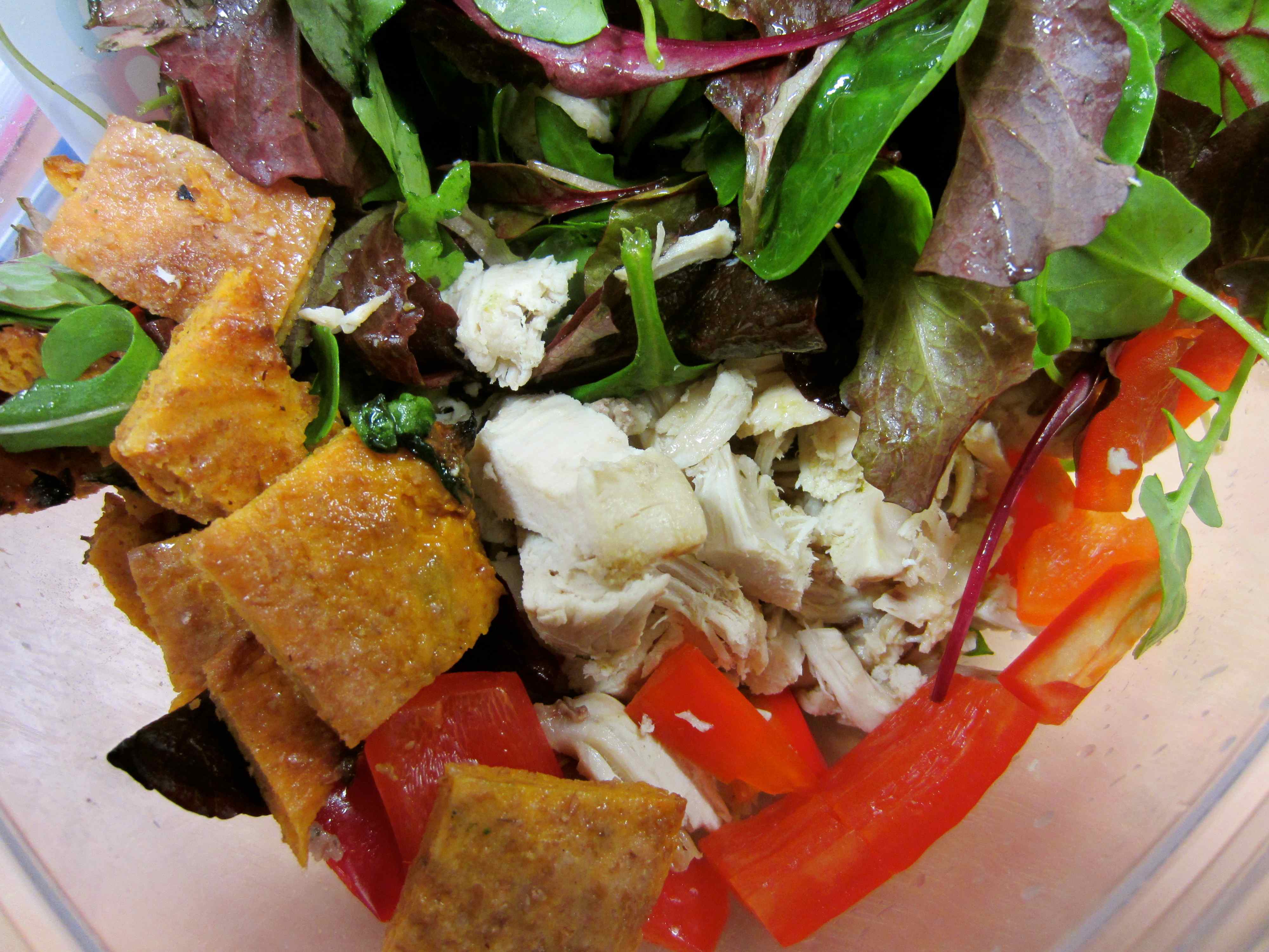 I took lunch in from home. I had roast chicken, sweet potato flatbread, mixed lettuce leaves, red pepper and spring onion with salad dressing. This dressing is my current favourite; 1tbsp each of olive oil, flax oil and white wine vinegar with a pinch of salt.