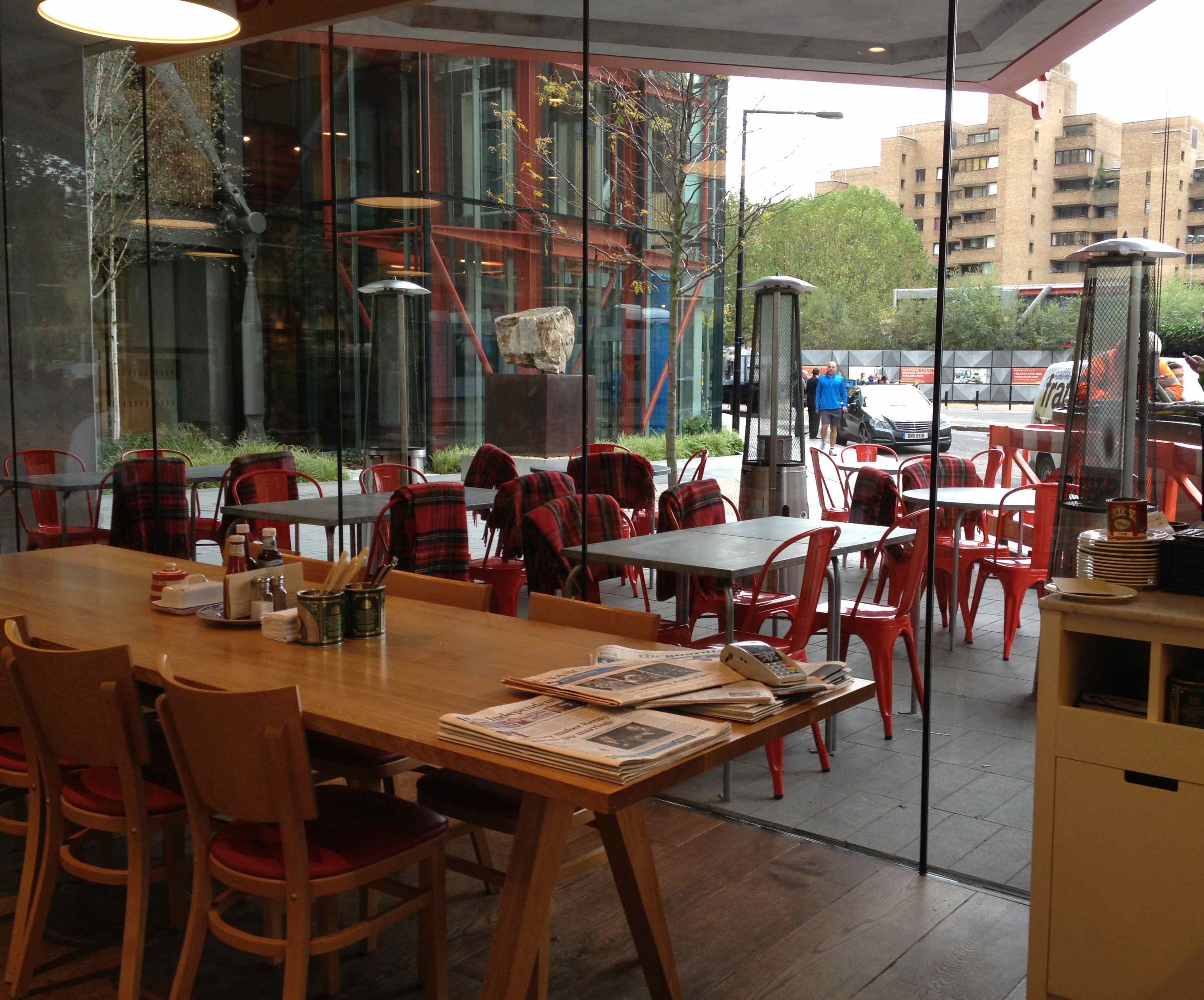 They have a heated outside area with blankets to keep you warm which is charming. I really wanted to treat myself to eating a hot breakfast inside the restaurant but I was too busy. So I bought a hot breakfast and took it out.