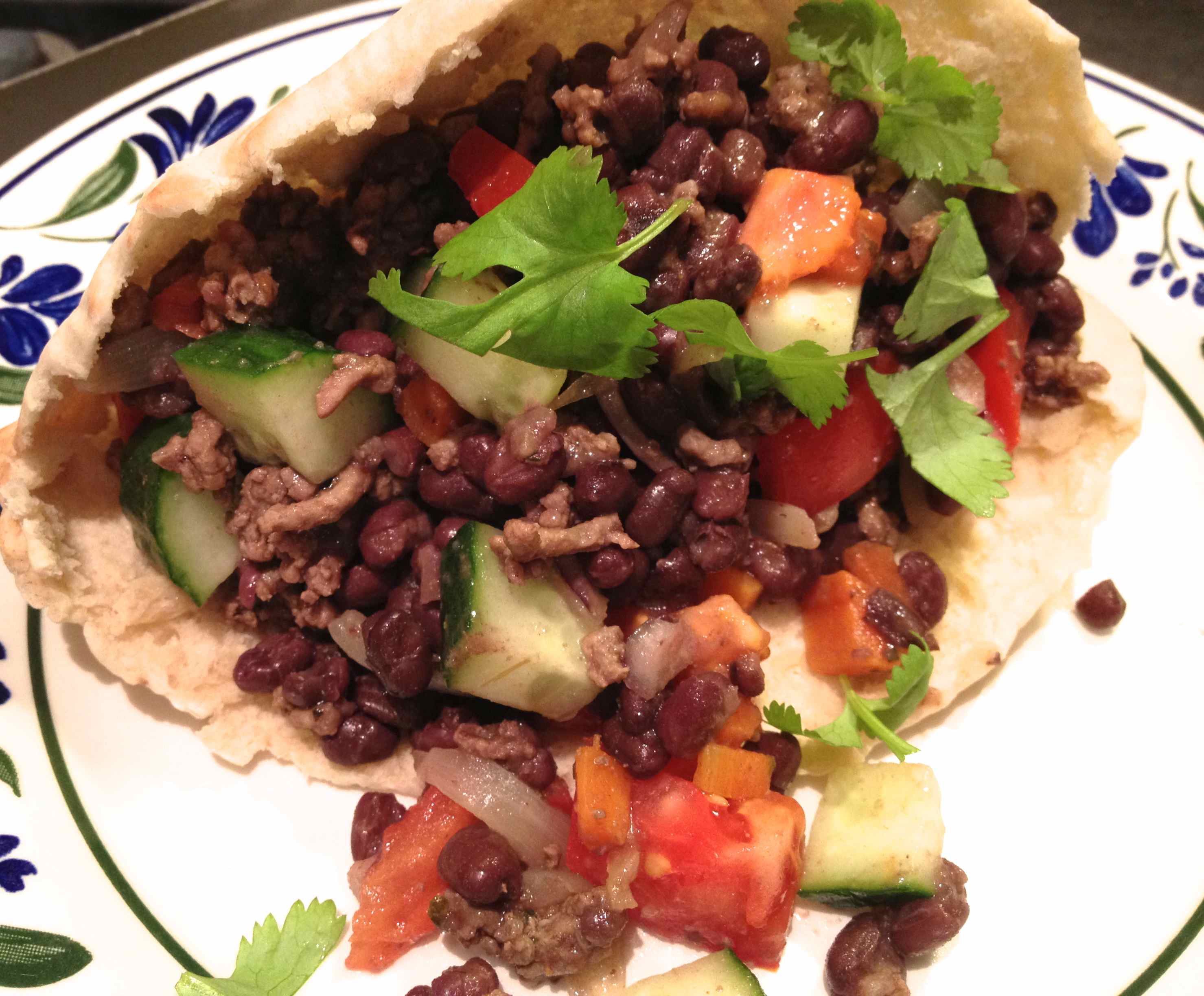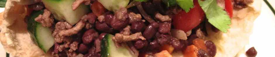 For supper I used up the remainder of the mince I made earlier in the week with the home made Fajita/Taco spices and I eked it out with some Aduki beans, cucumber, tomatoes and red onion.