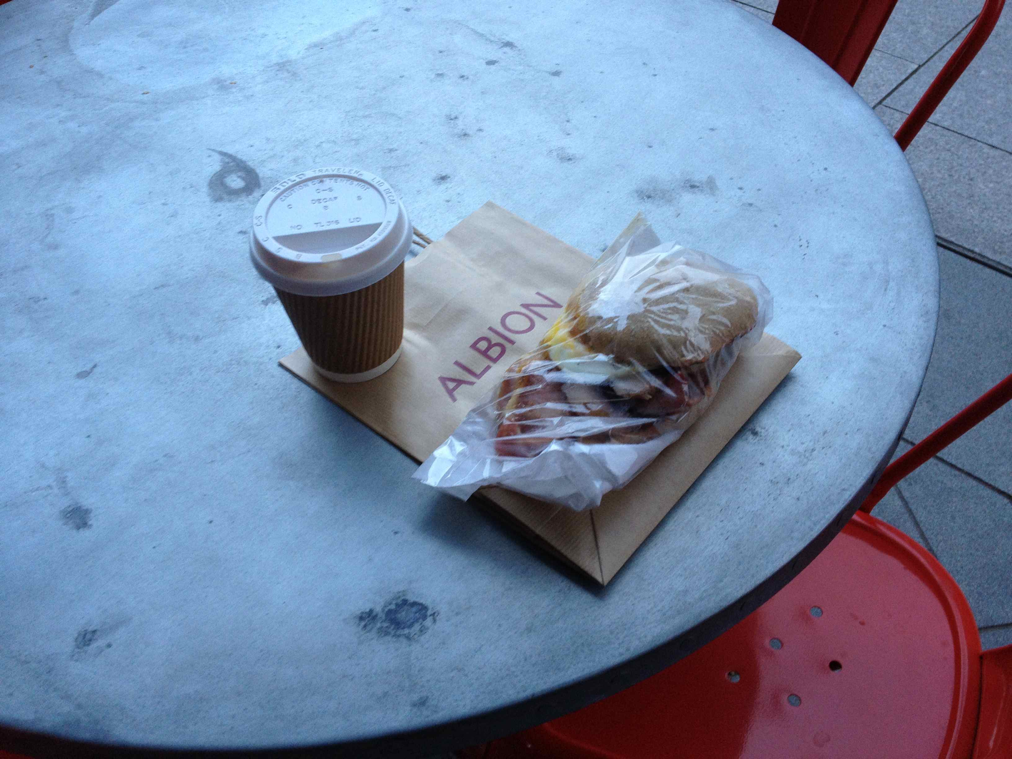 I braved the bitterly cold and walked round the corner from the office to the very excellent Albion. I treated myself to a latte and their fabulous breakfast bap which is excruciatingly expensive but worth every penny.