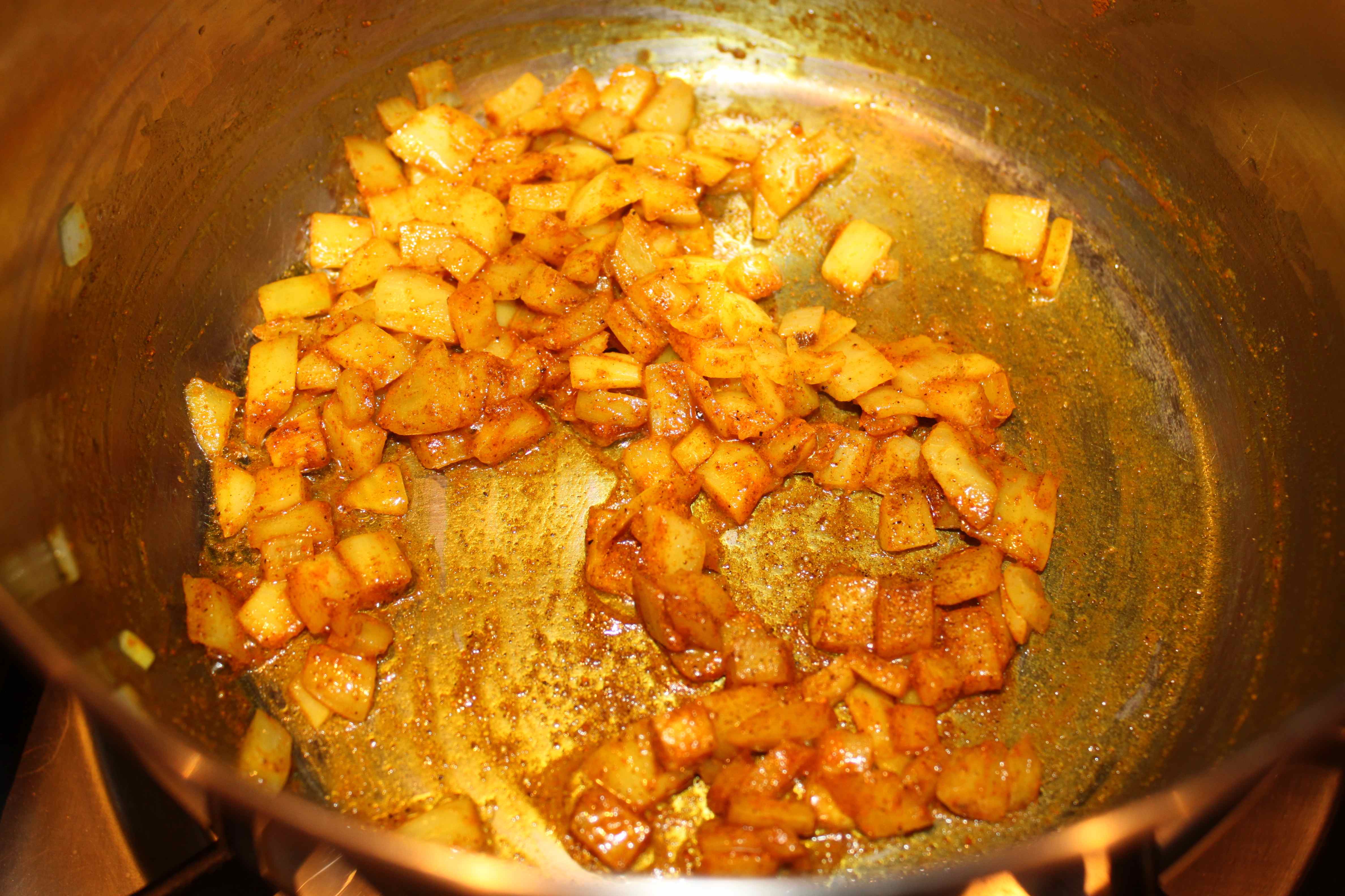 - Add the turmeric and garam masalla and stir to coat the onion in the spices