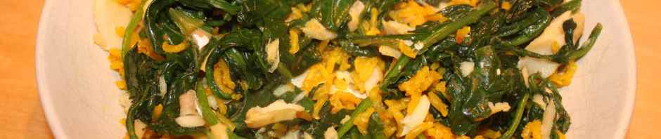 When the rice is done, heat a small amount of oil in a pan and wilt the spinach