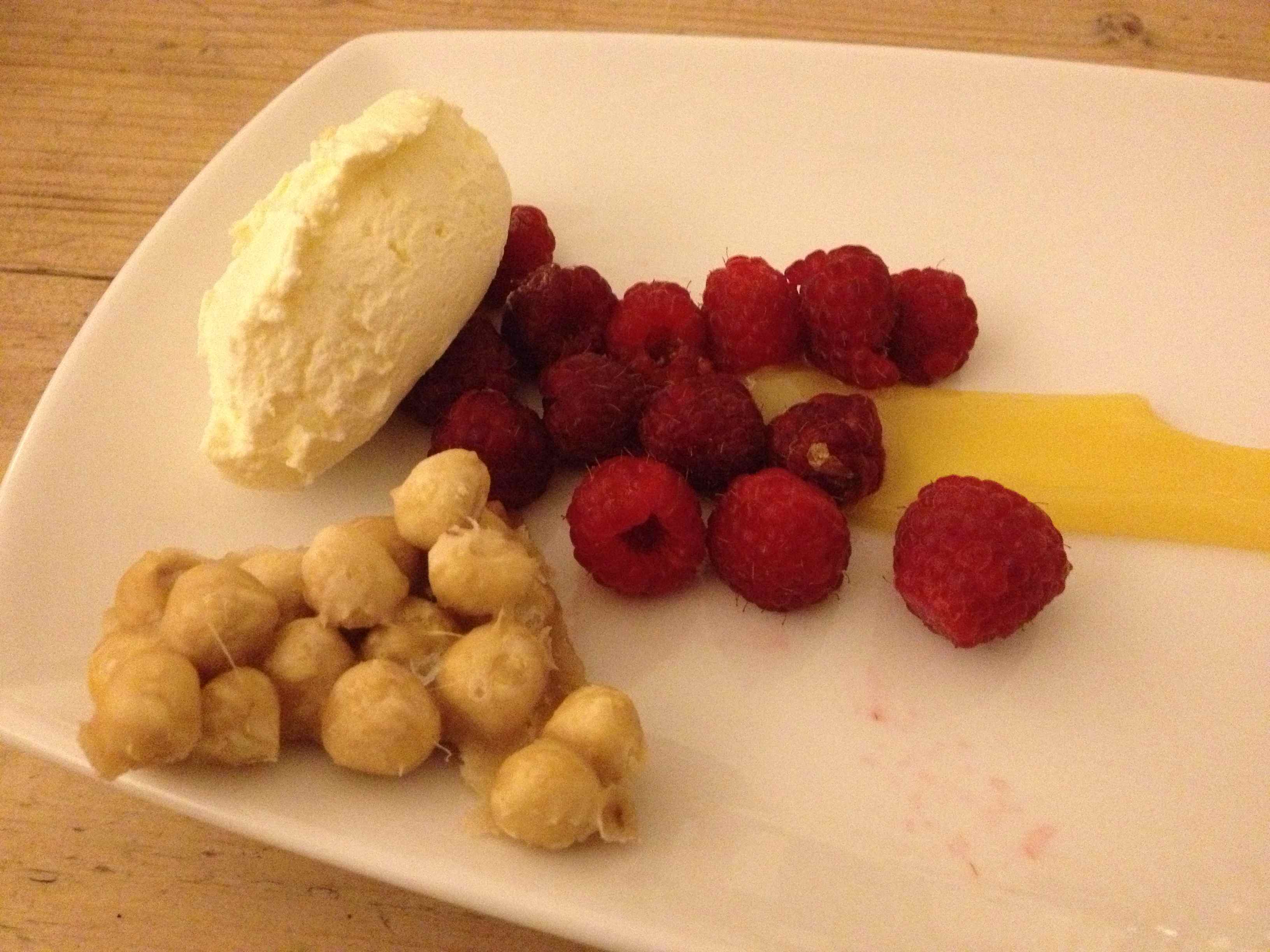 Dessert was mega. Whipped cream, raspberries and salted caramelised hazelnuts.