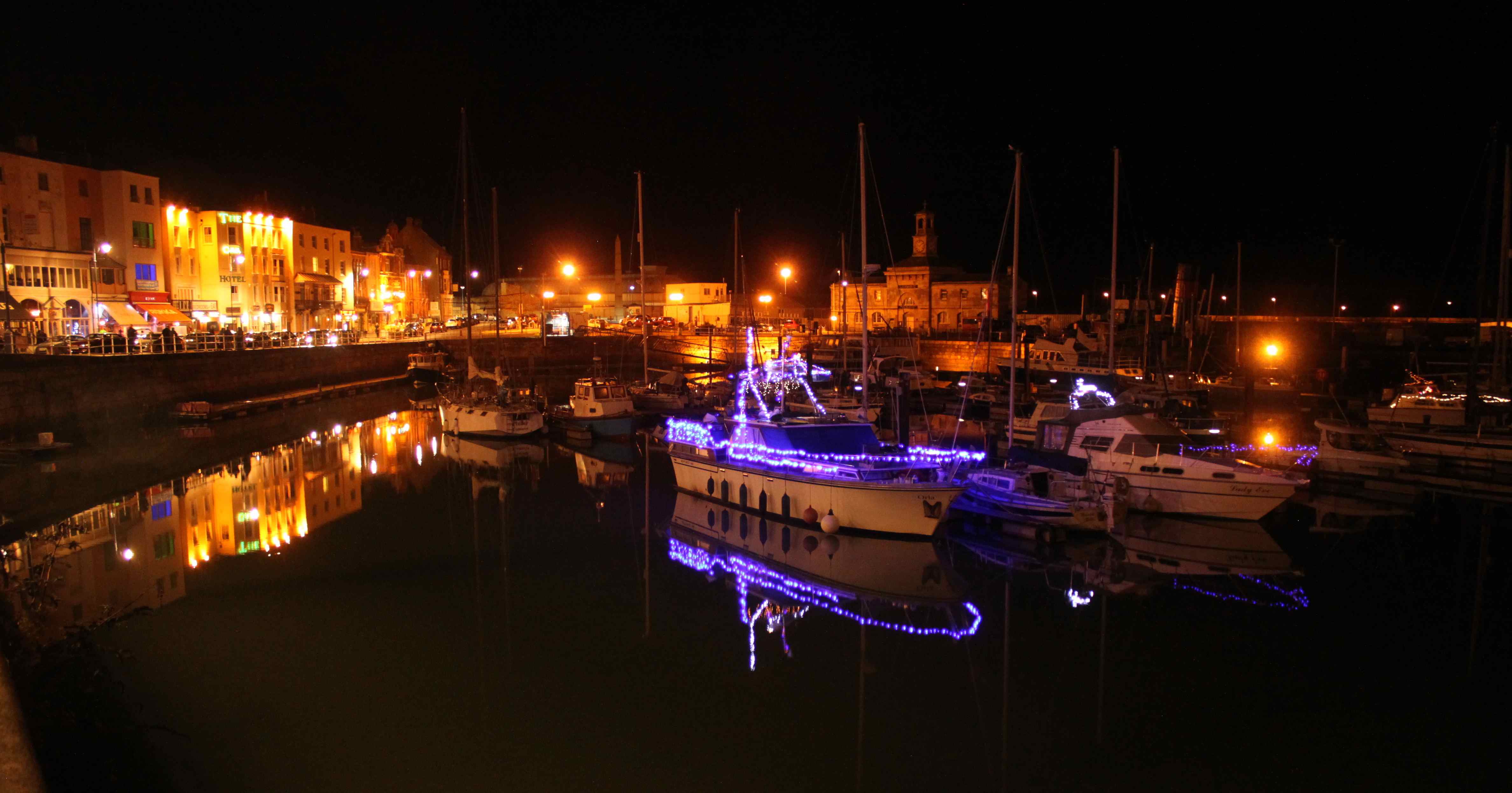 The marina looked magnificent in the dark. The quayside looked all bright and jolly while the boats bobbed about peacefully in their quiet dark water. Some boats were looking very festive.