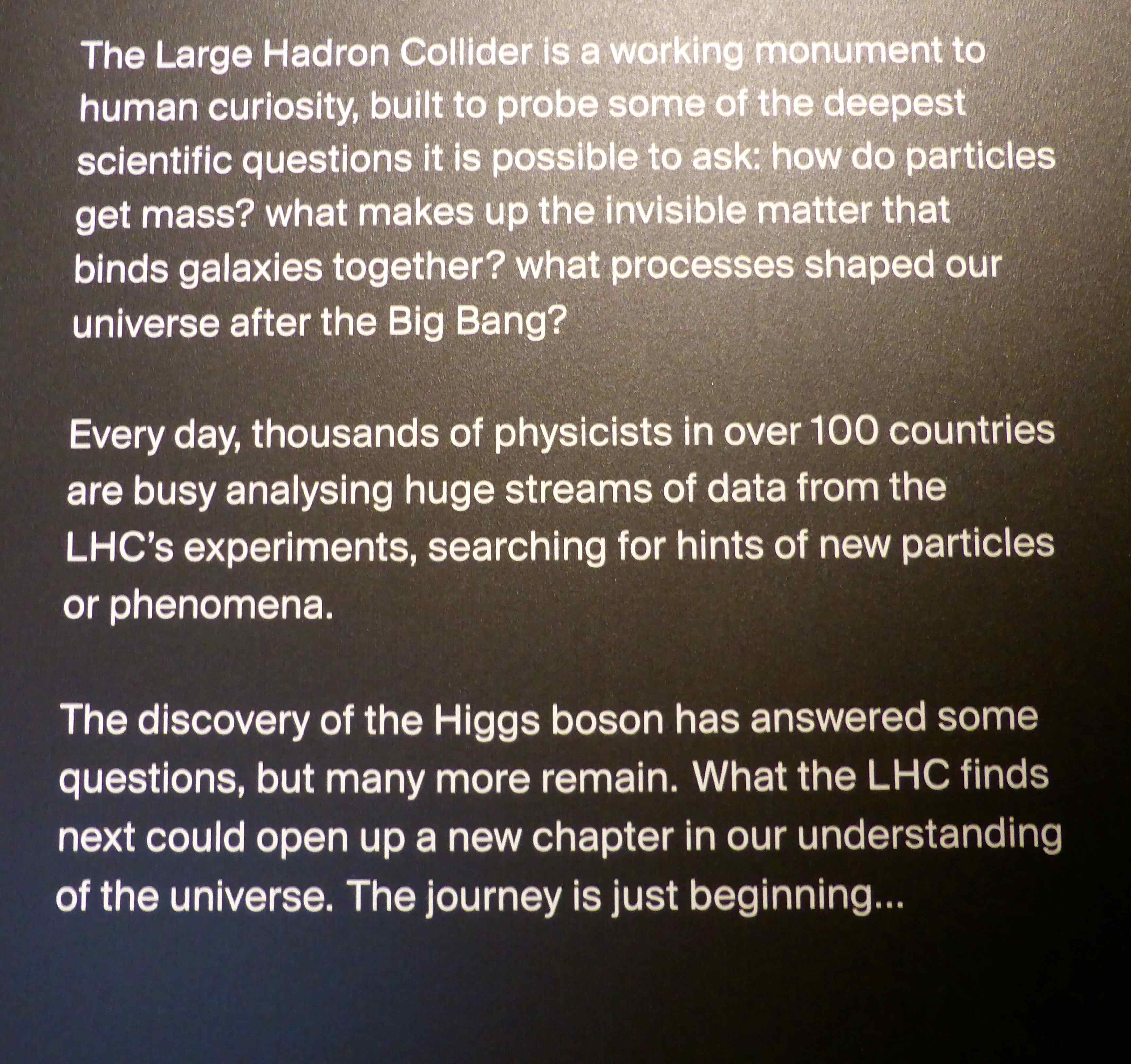 We went to the Science Museum with James’ sister Anne and her family and booked to see the special exhibition about the Hadron Collider. I will put my hand up at this point and state I am not very knowledgeable about science. I happily gave up science after O’-Levels. However, I know the Higgs boson is a big deal, I don’t really understand it and was keen to discover more.