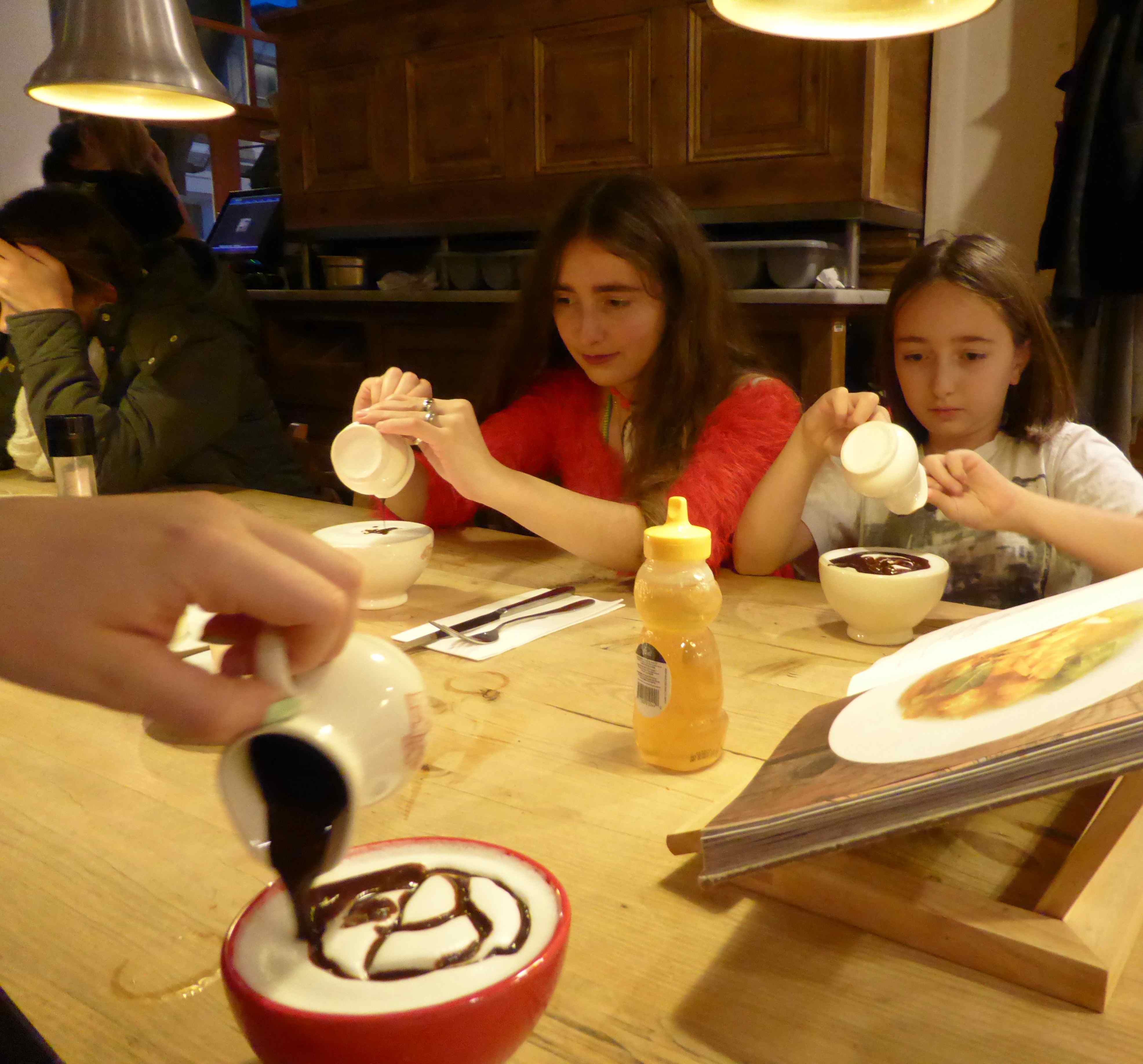 We eventually found a space at Le Pain Quotidien which I am a fan of. We sat at their large “Sharing Table” which is perfect for groups. The younger members of our party had hot chocolate which is presented with the hot milk in a bowl and the chocolate served separately in a little jug.