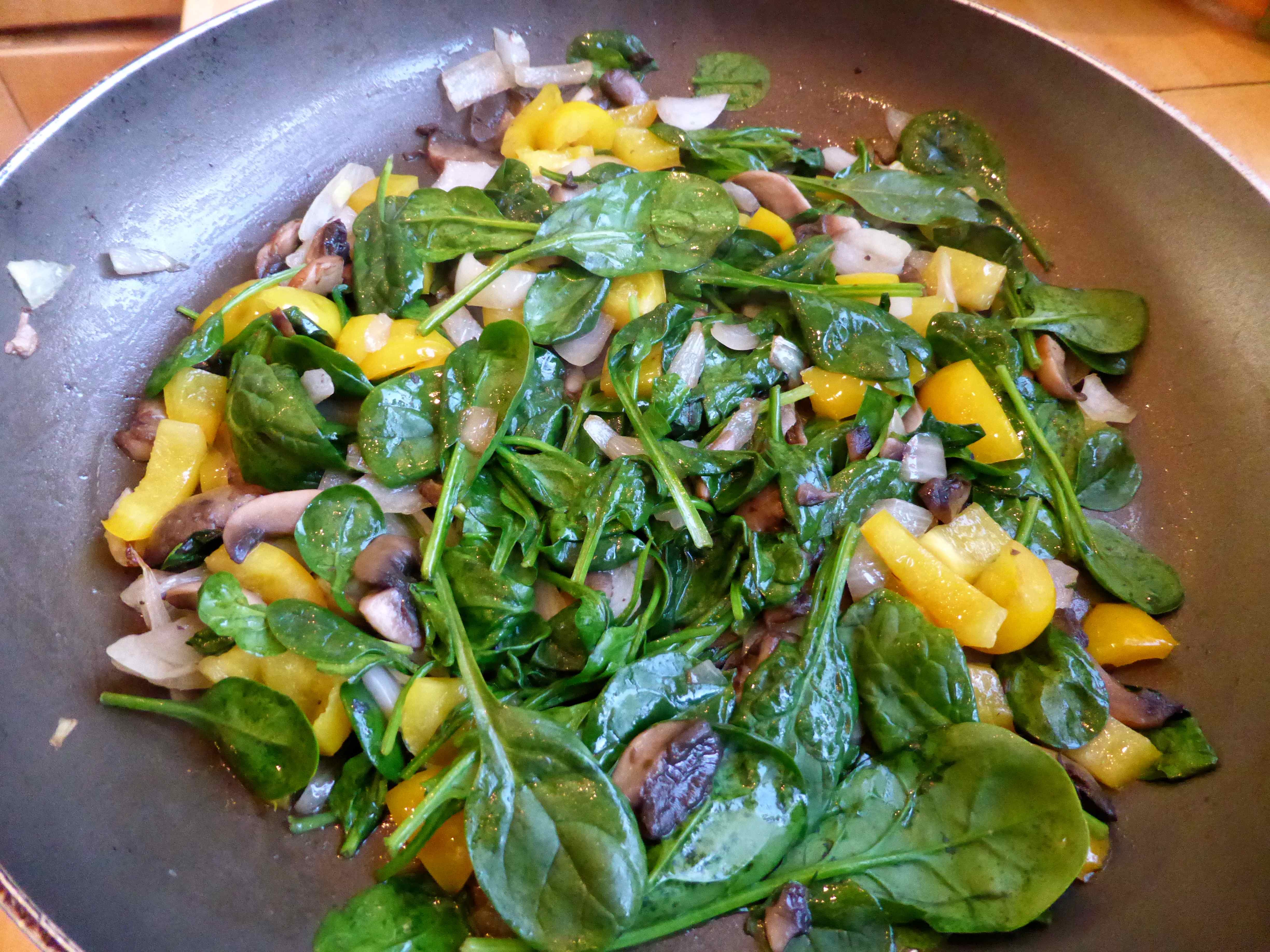 We had a lovely day in South Kensington today. I suspected, correctly, that lunch would be late so we had a substantial breakfast to keep us going. I stir fried some onion, yellow pepper, mushrooms and spinach in coconut oil.
