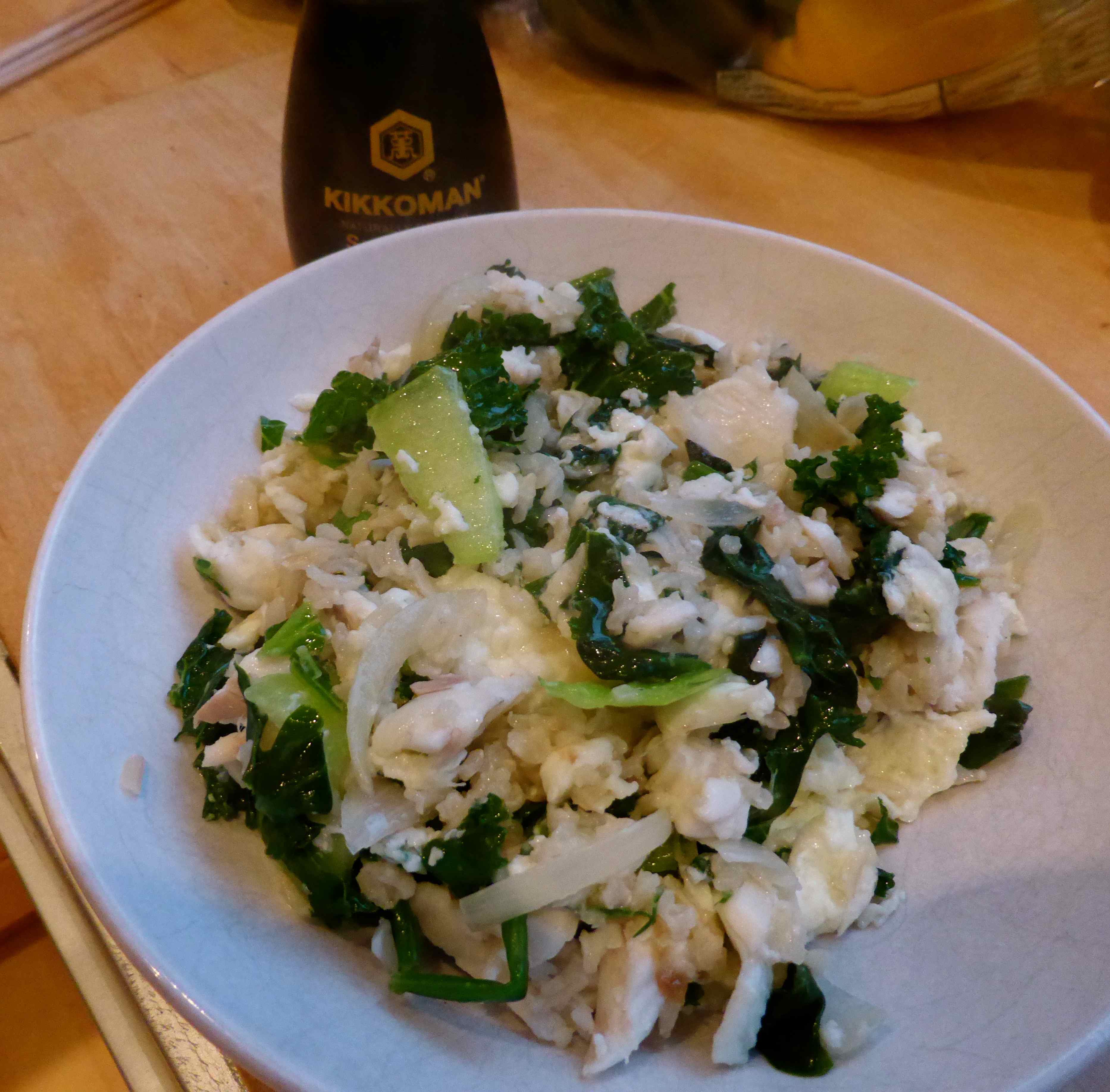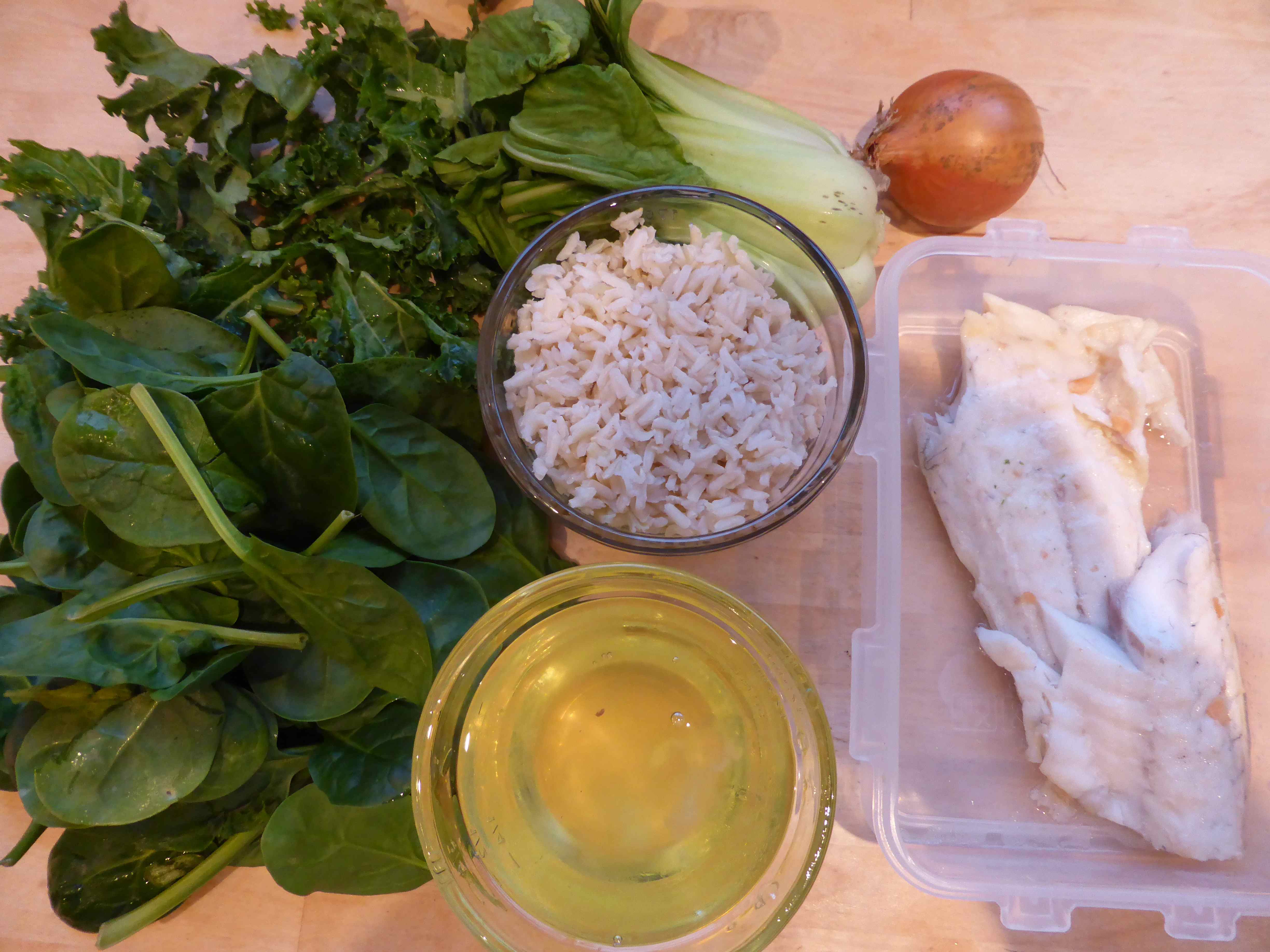 A quick forage through the fridge provided pak choi, kale, spinach, 3 egg whites, a cup of cooked brown basmati rice and a Sea Bass fillet. I also added an onion. This quantity was for 2 of us.