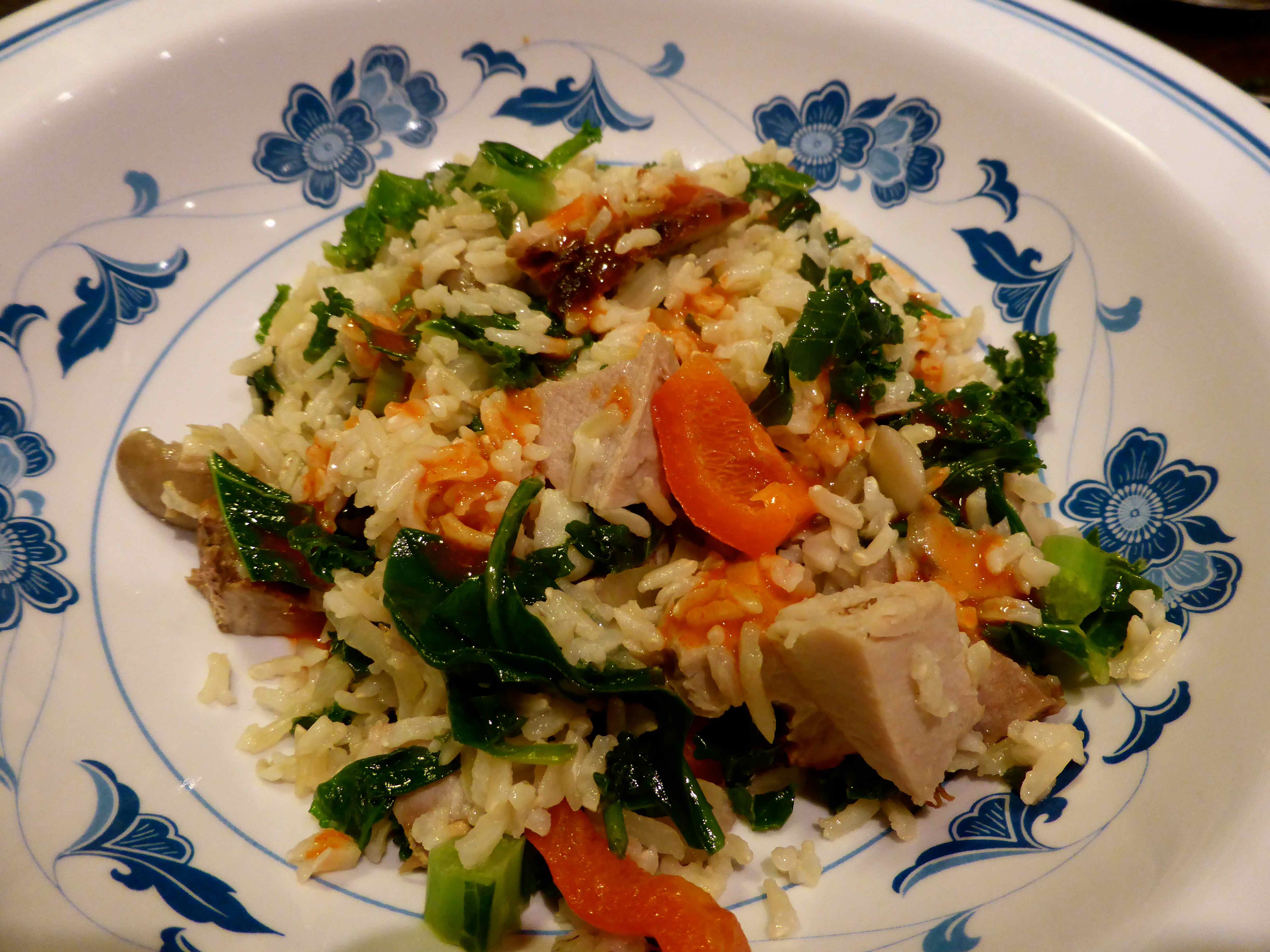 I added them to a salad.mackerel salad 3 My salad had brown Basmati rice, tomatoes, cucumber, celery and mixed baby leaves.mackerel salad 1 Plus the mackerel which I drained of oil.  No dressing.  Just the salad, mackerel and rice.mackerel salad I had a very modest sized portion of rice, stir fried in coconut oil with left over lean roast pork, red pepper, kale, spinach, onions and mushrooms.  With some soy sauce and Cholulah for spice.pork stir fry